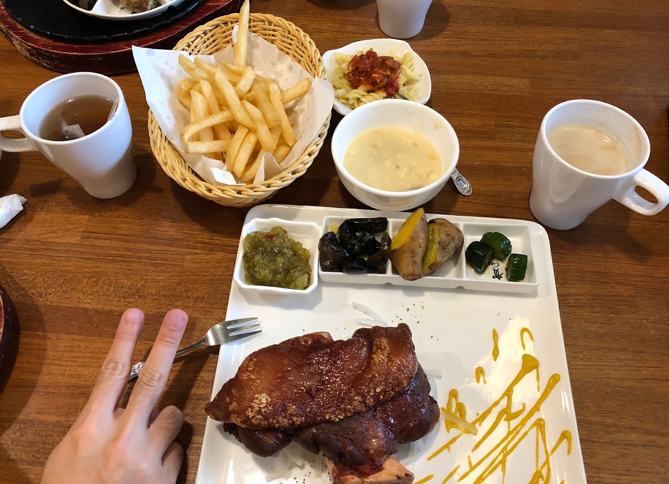 德國豬腳好吃,用料實在, 自助吧檯區的補給也很大方, (水果有三種、甜湯是銀耳湯、鹹湯是玉米湯、咖啡機是WMF的,另有可樂、茶包可供選擇) 老闆、員工熱情且親切, 薯條、麵包、義大利麵可以續加無限次, 很有誠意的一間店!!! 有機會會再訪!