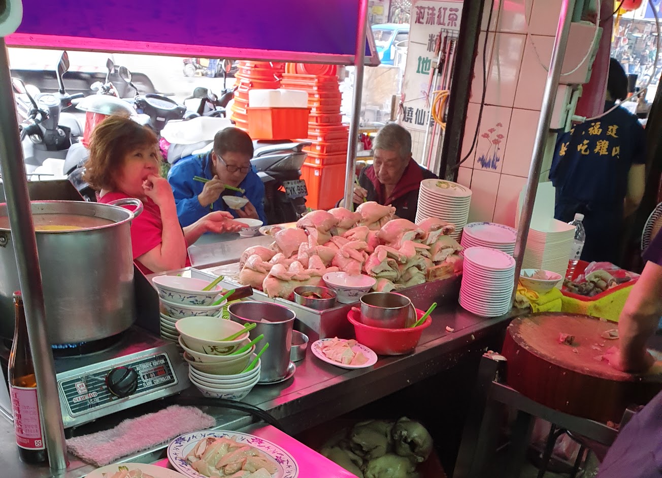 人超多、道地的菜市場平民美食,在意環境啥的就不用來了~進店時服務人員就會直接問要大還小盤、然後送上雞油飯和湯,雞肉真的很鮮甜好吃(多餘的醬還可再用來拌飯),冬天配上下水湯暖暖的剛剛好,可惜只開到下午。