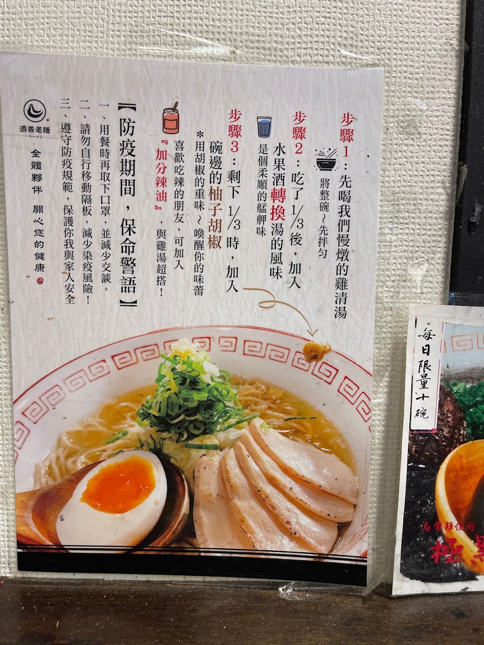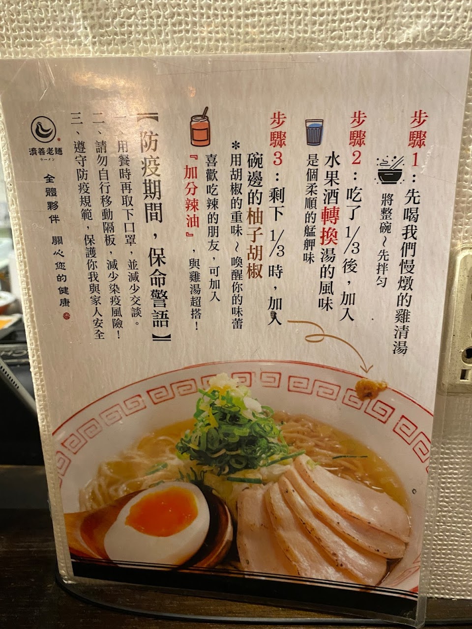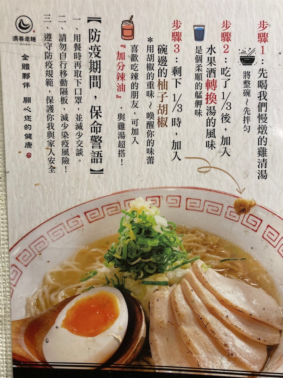 將臺式的風味日式化,真的超過臺式拉麵的天花板,單純雞湯融合兩種風格,昇華為完全不同的層次。招牌裡的三口味(原味雞湯、水果酒 口感7~15%、柚子胡椒)間切換,可以排列組合出六種美味,非常具有特色。