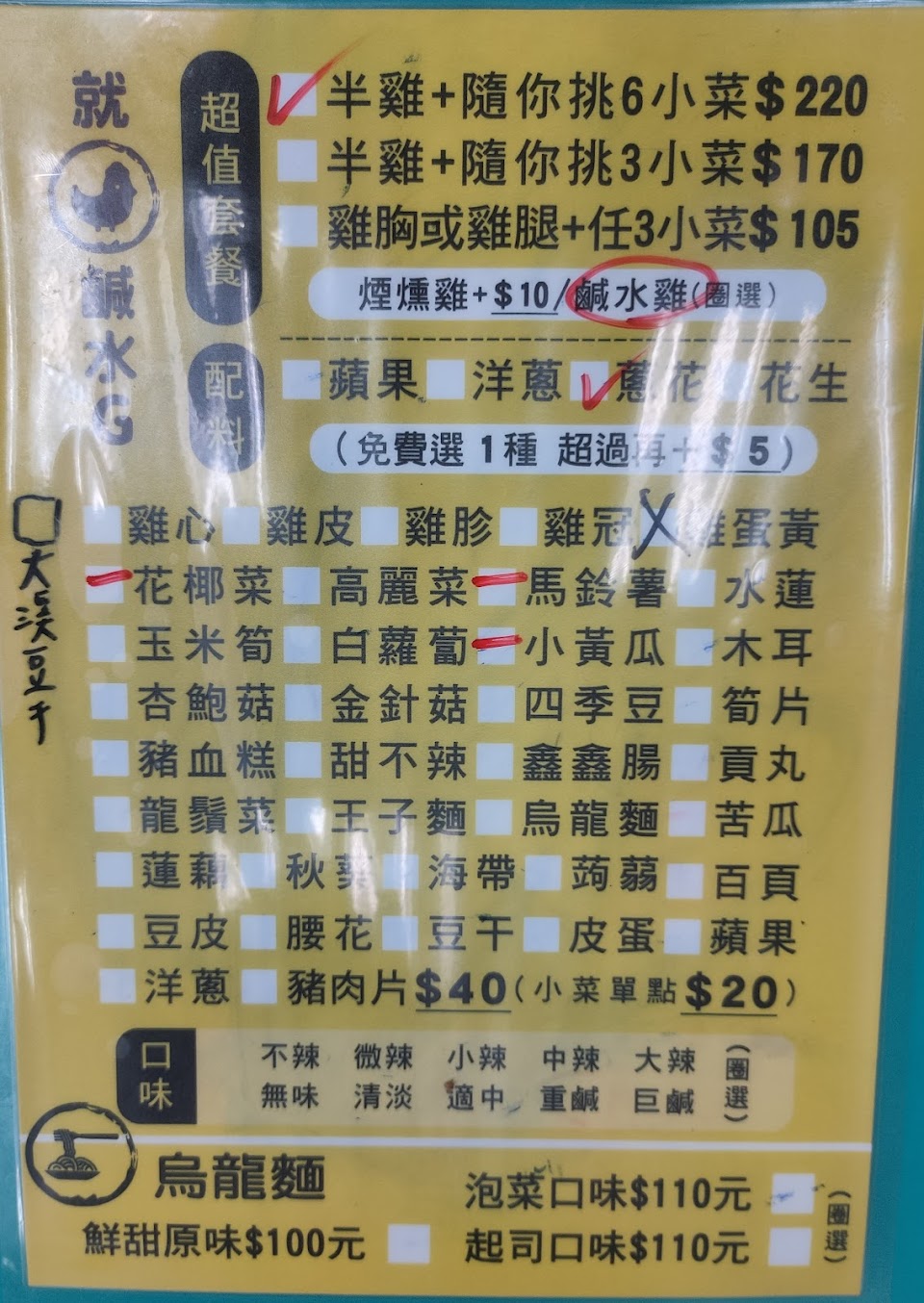 《就 鹹水雞》 半雞+隨你挑6小菜 售價230元 小菜 單點售價20元 使用原產地台灣雞肉,雞肉本身香嫩皮又Q彈,搭配滑嫩多汁的杏鮑菇、清涼脆口的海帶、清爽解膩的小黃瓜、滑嫩順口的烏龍麵、新鮮翠綠的花椰菜及玉米筍、甜不辣,調味的部分則是會灑上胡椒粉、蔥花、辣椒、雞汁、香油,吃起來更夠味更鹹香