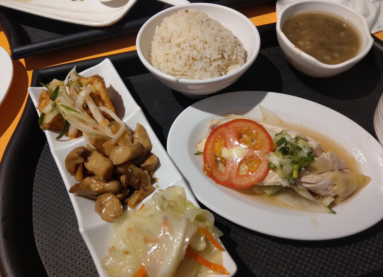 今天點了海南雞飯 飯是用香米很不錯 雞肉有些部位有點柴 竟然有三樣配菜還不錯 跟正宗海南雞飯不太一樣 有湯及甜湯 所以一百三十元的價格可以接受 醬油可惜了 不是油膏 跟正宗海南雞飯不太一樣