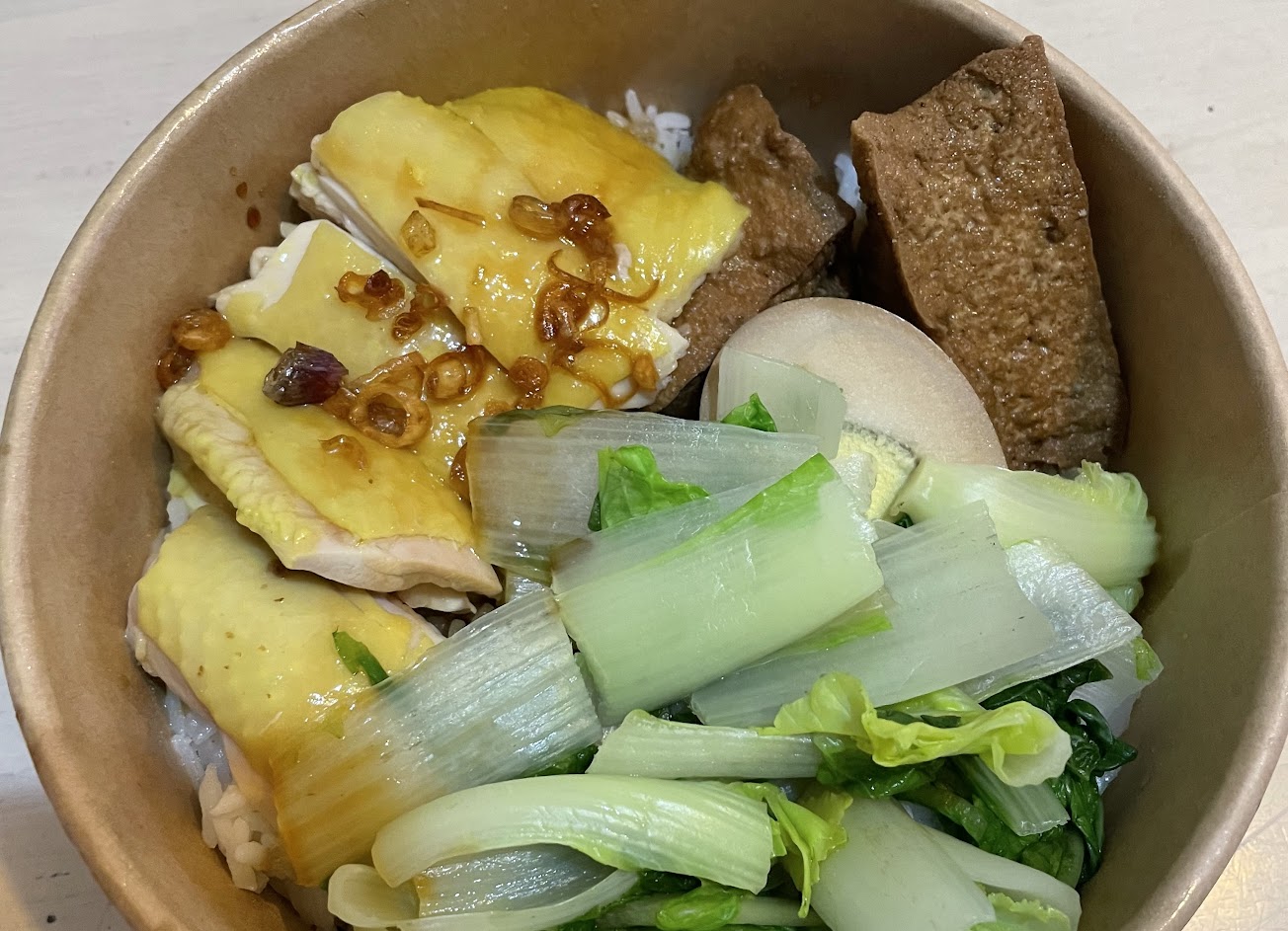 寶島海南雞飯的雞肉嫩又彈 蔬菜份量多 豆乾有厚度 價錢配上這樣的菜色和份量是值得的