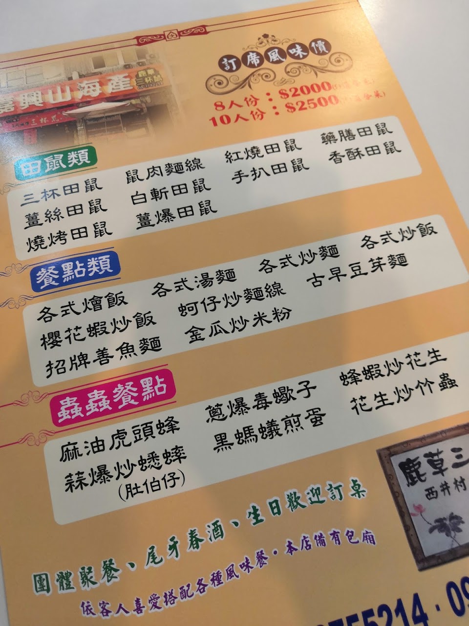 鹿草!我不知道你為什麼會來這邊?既然來到了,就一定要來這裡品嚐!三杯田鼠、酥炸蟋蟀(還有炒飯,必點!)若是夠細心,試看看可口可樂