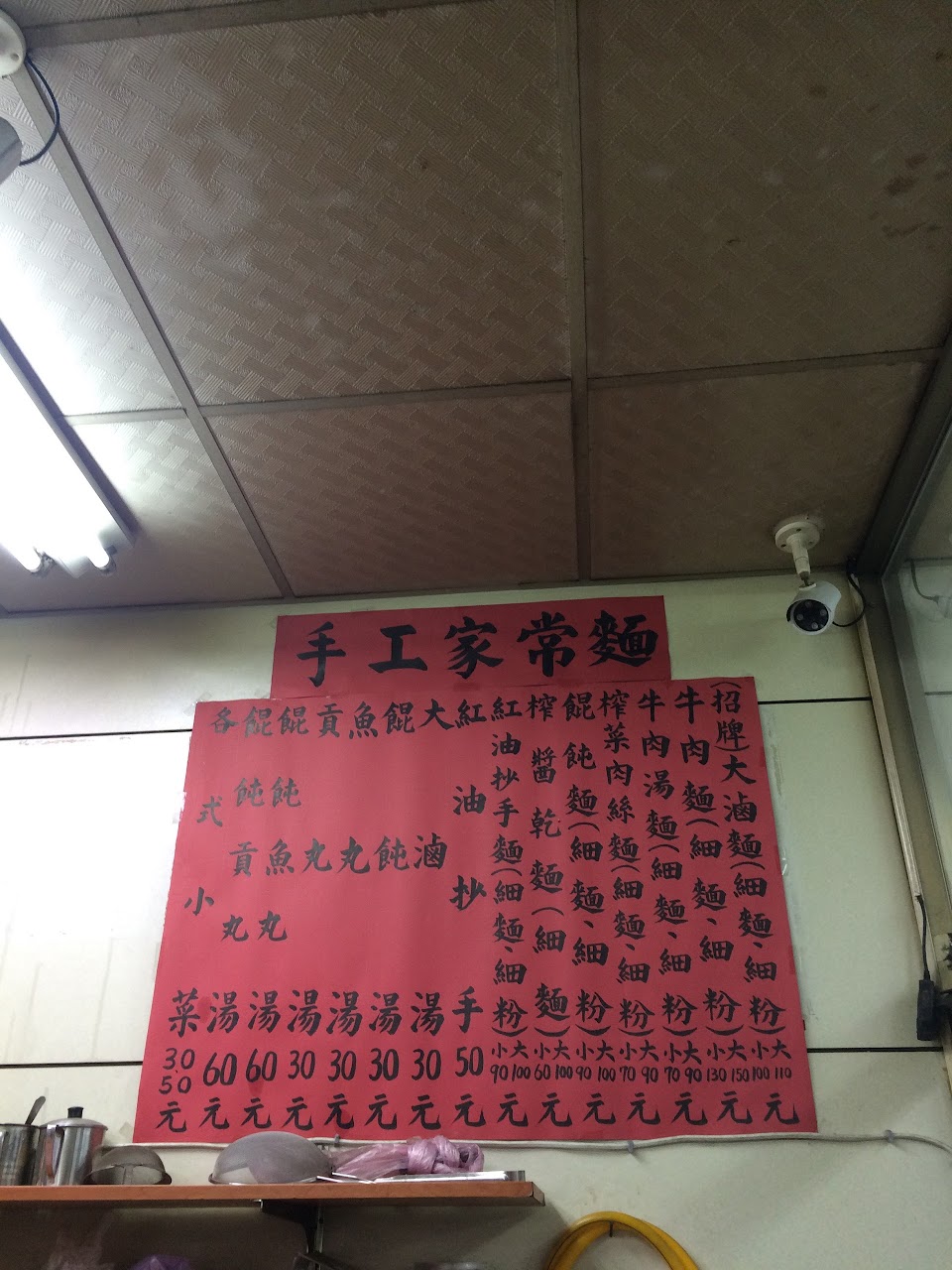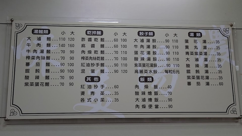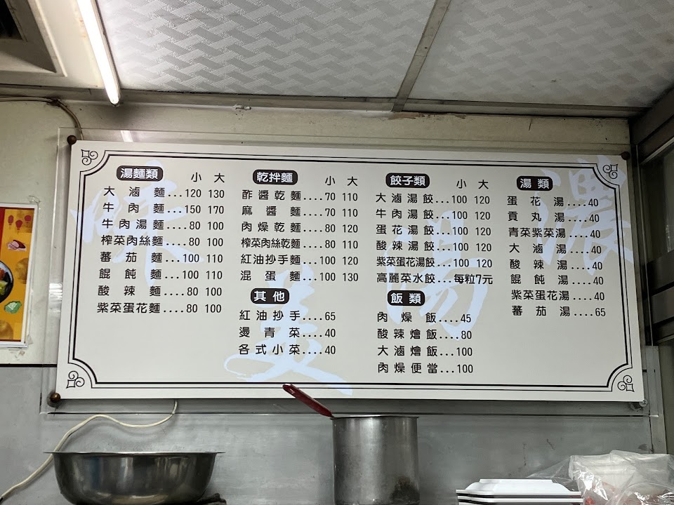 ?菜單包括各式麵食、水餃、湯類、飯類及小菜。找好位置填寫菜單,飯後結帳,小菜在冰箱內可自取。