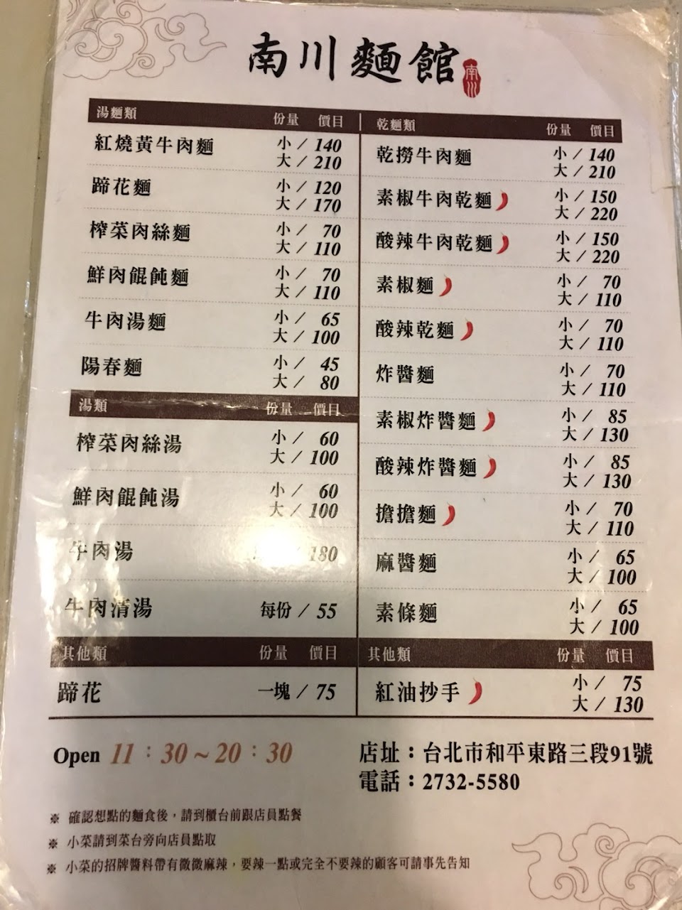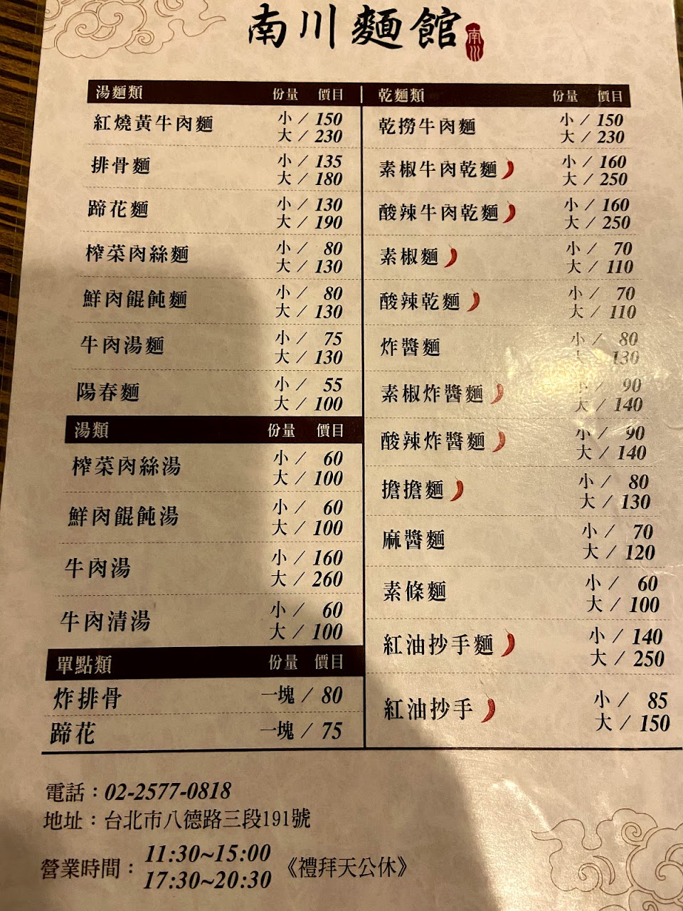 別小看這一小碗的酸辣麵,連大陸都吃不到這麼道地的酸辣麵!還有南川麵館的蹄膀麵,只要130元,光就是足料、大塊的豬腳蹄髈就不只130元,更何況湯頭鮮美,麵條入味可口!知名的牛肉麵店一般的豬腳一分就要150元。紅油抄手搭配榨菜肉絲麵,風味絕佳!更值得一提的是南川麵館整日無休,隨時來都有得吃,其他牛肉麵店“牛”的很。還要睡午覺!南川只有週日休息。冷氣整日不關機(一般小吃在非巔峰時段都將冷氣關機)