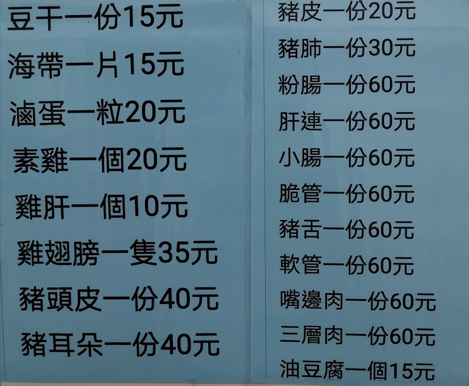 身為蛋控的我第一名一定要推薦滷蛋!外表看似滷蛋,糖心卻過於常人,而且糖的這麼恰到好處,呈現凝膠狀但不會滴落,打爆一堆拉麵名店,重點是才$15!!豆干、素雞、海帶都軟而入味,尤其素雞跟一般麵店厚厚硬硬只靠吃醬料味道的完全是天壤之別,海帶沒有腥味。三層肉不油膩,沒有豬騷味。豬耳朵是純脆骨部分,不含頭皮,想同時吃頭皮的朋友可能要留意一下。不到19:00油豆腐已完售,到底多好吃?下次一定要吃到(握拳)。