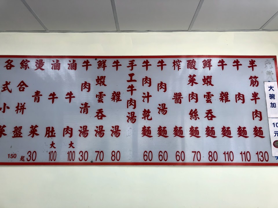 點了一碗牛肉麵($110),結果老闆自動把我改成半筋半肉牛肉麵($130),問他為什麼改成半筋半肉?回答是:啊就把你改成半筋半肉啊!?做生意真有一套,景氣不好什麼賺錢手法都有,不簡單!