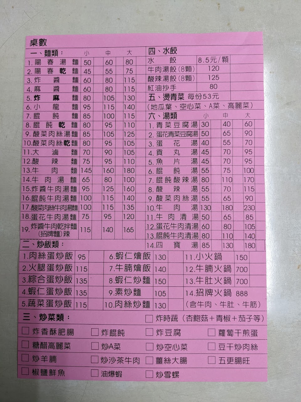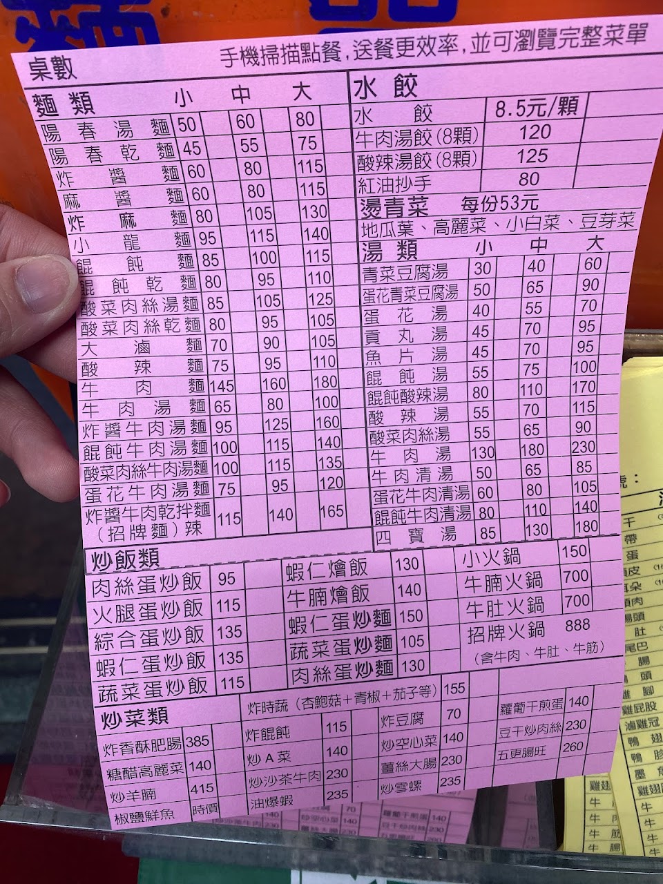 ?菜單包括各式飯麵類、滷味、小菜、湯類、炒菜及水餃等,品項挺多,內用安排位置後,手機掃碼點餐,要加點也很方便,支持電子支付,開立發票。
