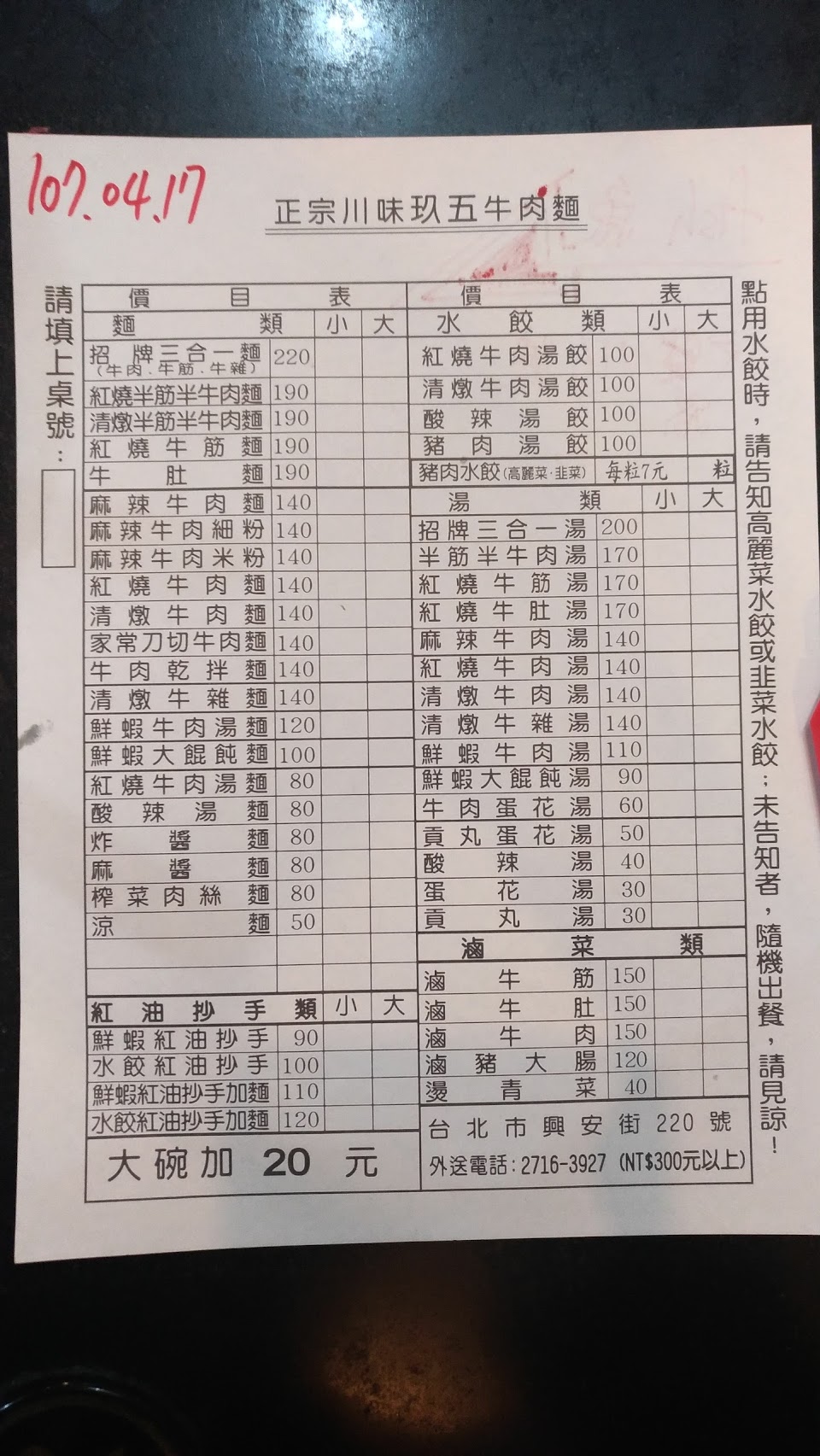 有提供非免洗餐具 沒禮貌的店家,下午2點多用餐,吃到一半,頭上的燈就關了,如果是有中場休息,這樣趕人已經莫名,更何況它又沒中場休息,這樣節省,讓人擔心會不會也省在食材上,拿空白菜單放桌上,邊吃邊想要加點什麼,結果店員不發一語直接拿走,然後放我的帳單。 牛肉麵OK 鮮蝦紅油抄手加麵110,好吃 麻醬麵80:濃郁好吃且醬多但麵太少,都不夠配醬 炸醬麵80:OK 榨菜肉絲麵80,還不錯 豬肉湯餃100元,10顆7元餃子,湯普普卻是30元,直接單點水餃比較好 小菜 豬頭皮50,大溪豆干+百頁+圓甜不辣45,中規中矩 貢丸湯30,丸子OK ,湯淡,不喜 醬料區蠻多樣,特別是辣醬,可惜都沒加蓋