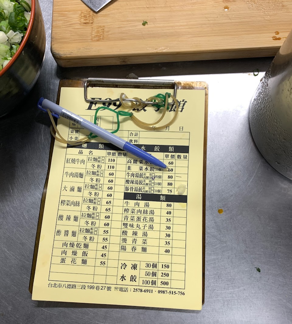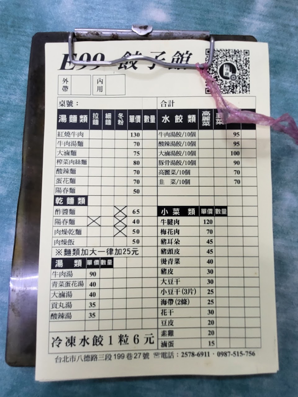 ?菜單樣式主要包括各式麵類、水餃、湯類及小菜。用餐完結帳。