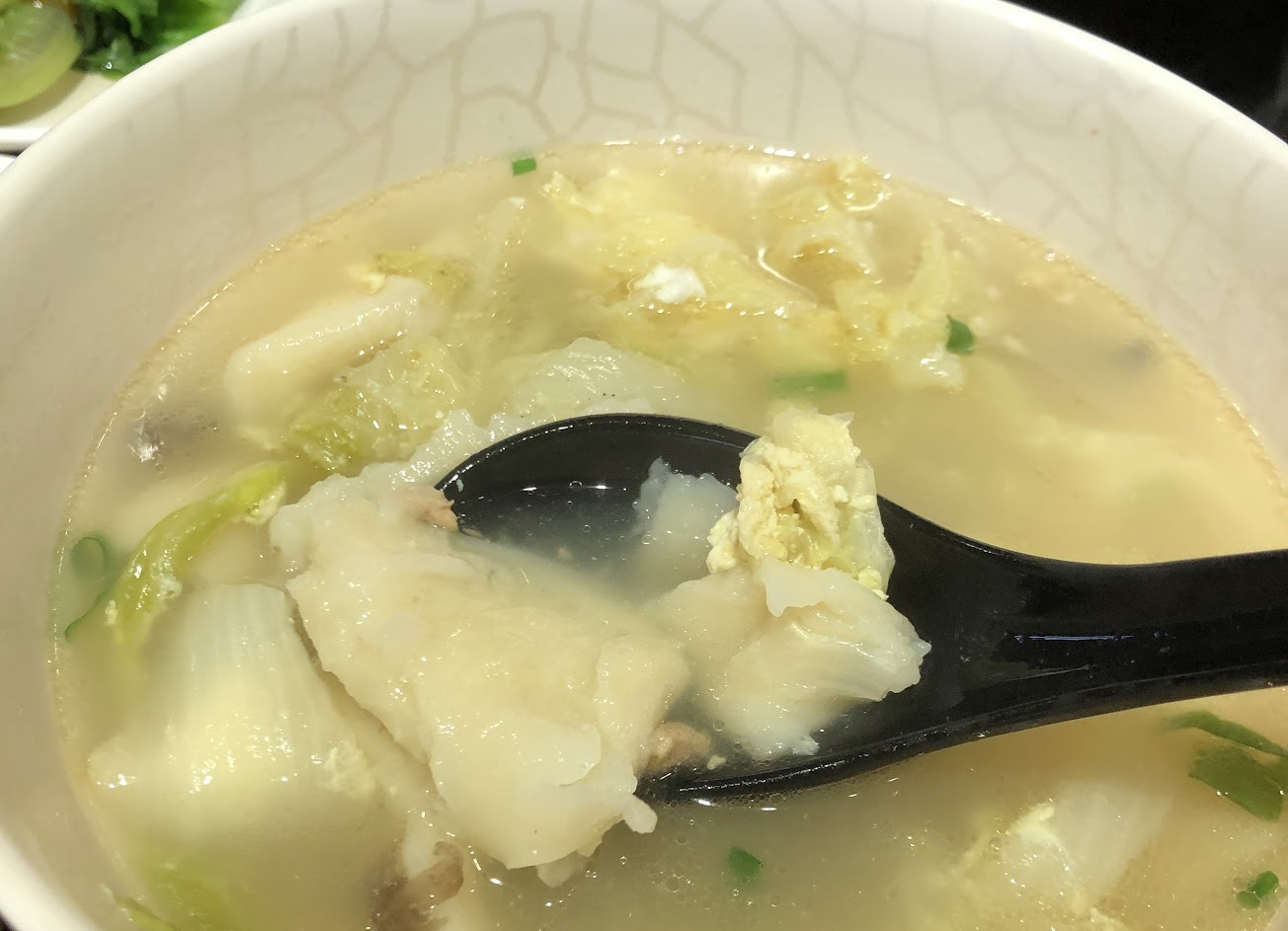 一樣是山東白菜加上1小匙肉醬上桌,湯頭依然好,片兒湯麵原來就是麵疙瘩,QQ的很推薦。