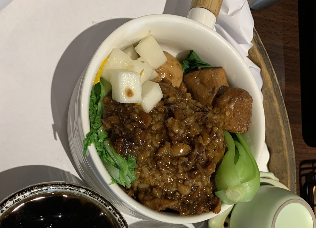 從外面的木頭桌椅看,給人的感覺是一家咖啡店,但這是一個提供美味豬腳的地方,可以選擇米飯或麵條、牛肉麵和豬肉餃子,菜品從50到320不等,點了一份米糕或蒸糯米,吃起來非常美味和芳香,除了點了幾個小菜,如牛筋和牛肚,這是我這輩子吃過的最好的牛筋,贊一個,至於招牌豬肉指節面下次試試