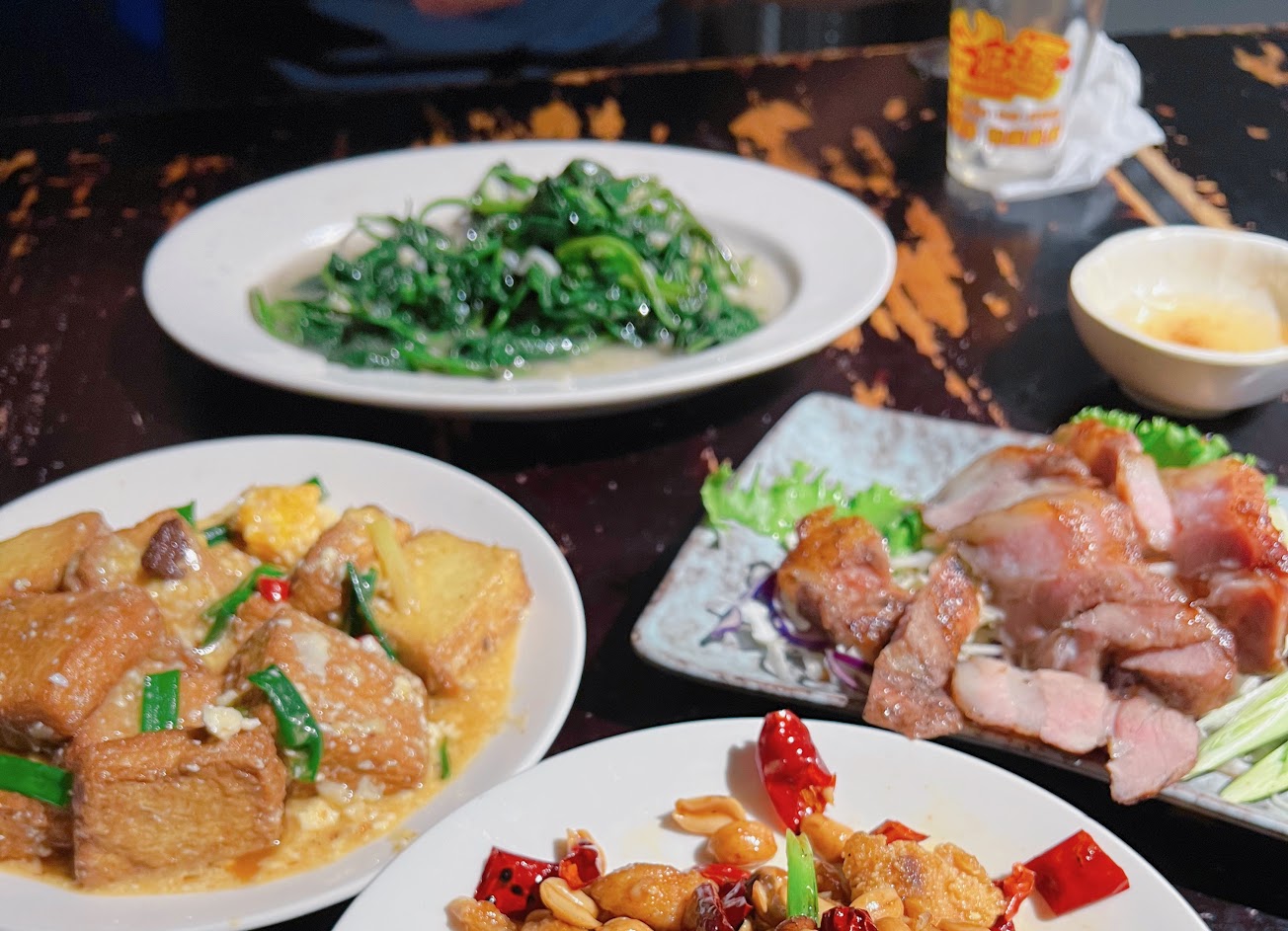 老皮嫩豆腐 金沙中卷 蒜泥白肉 三杯中捲 炒劍筍 清炒地瓜葉加辣 以及炒山豬肉