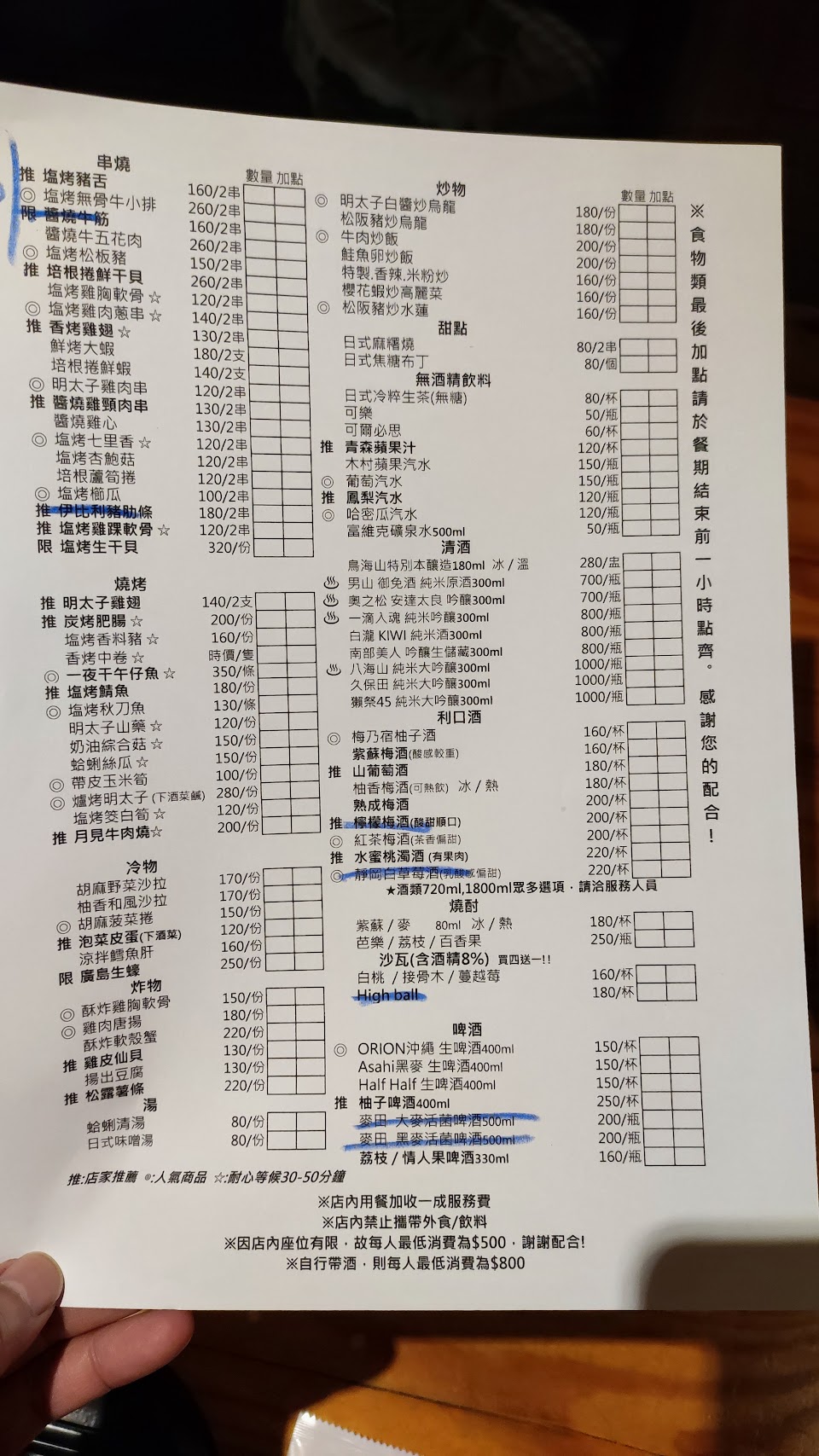 推薦菜單:烤豬舌、明太子烤雞胸肉、烤杏鮑菇、烤雞翅(大推,第一次吃到這麼軟嫩又好剝的雞翅)