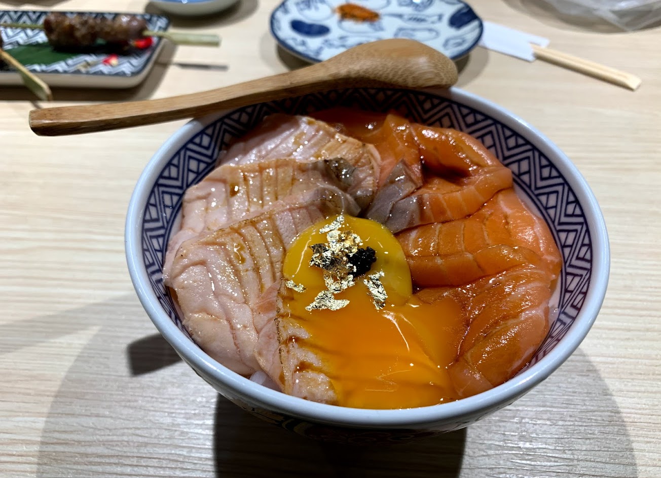 很浮誇的一家店~哈哈哈,生蠔干貝上都撒了金箔。月見四色丼有干貝、鮭魚卵、海膽、鮪魚肉,是我喜歡的組合,不過飯有點硬。月見雞肉團還不錯。牛舌也有點硬。奶油味增湯倒是很美味。店內環境不錯,消費不便宜。