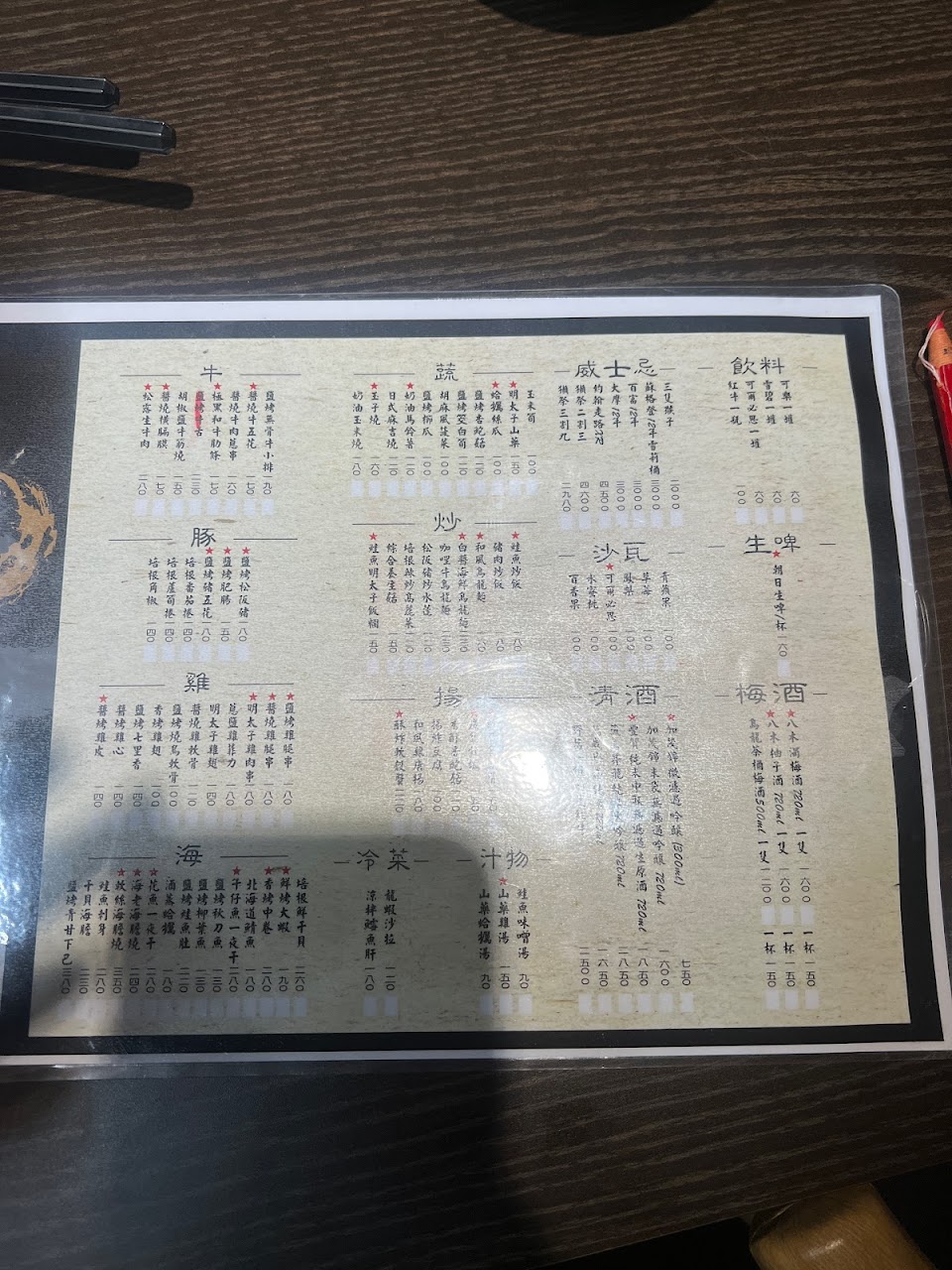 極黑和牛肋條 酒蒸蛤蜊 燒麻糬 一夜干 小菜 招待 炒水蓮 烤鯖魚 鹽烤筊白筍 明太子玉子燒 鮭魚肚 雞軟骨 肥腸 鮭魚炒飯 烤五花肉串 小卷烤