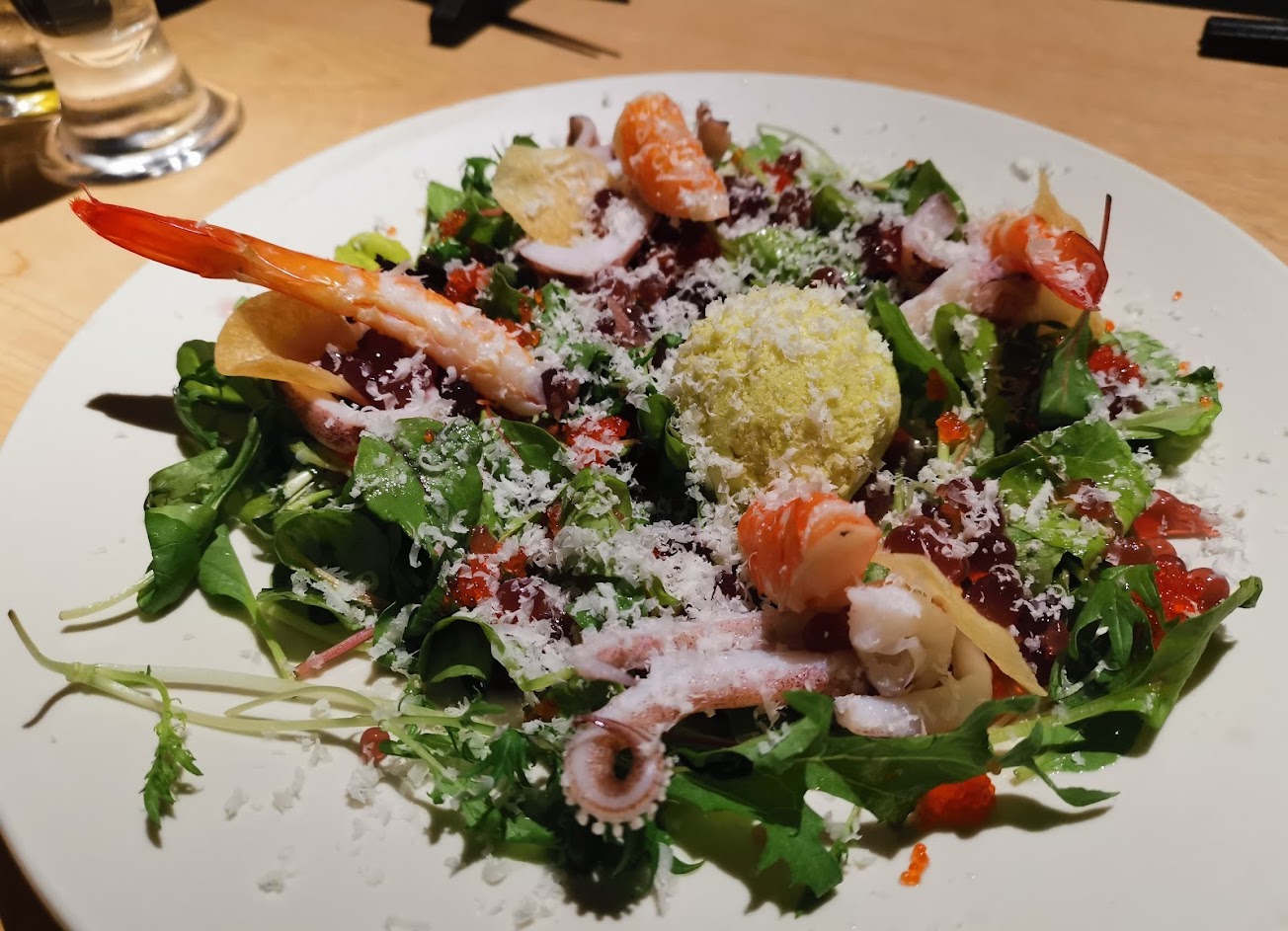 非常美味的現代日本料理,口味創新,擺盤精美。服務也很棒。點了海鮮沙拉配芥末冰糕、脆皮雞腿配檸檬泡沫、馬頭魚配脆鱗、茴香奶油/蔥油、炭燒雞塊和芥末配海膽。用餐時享用了一杯清爽的柚子酒。