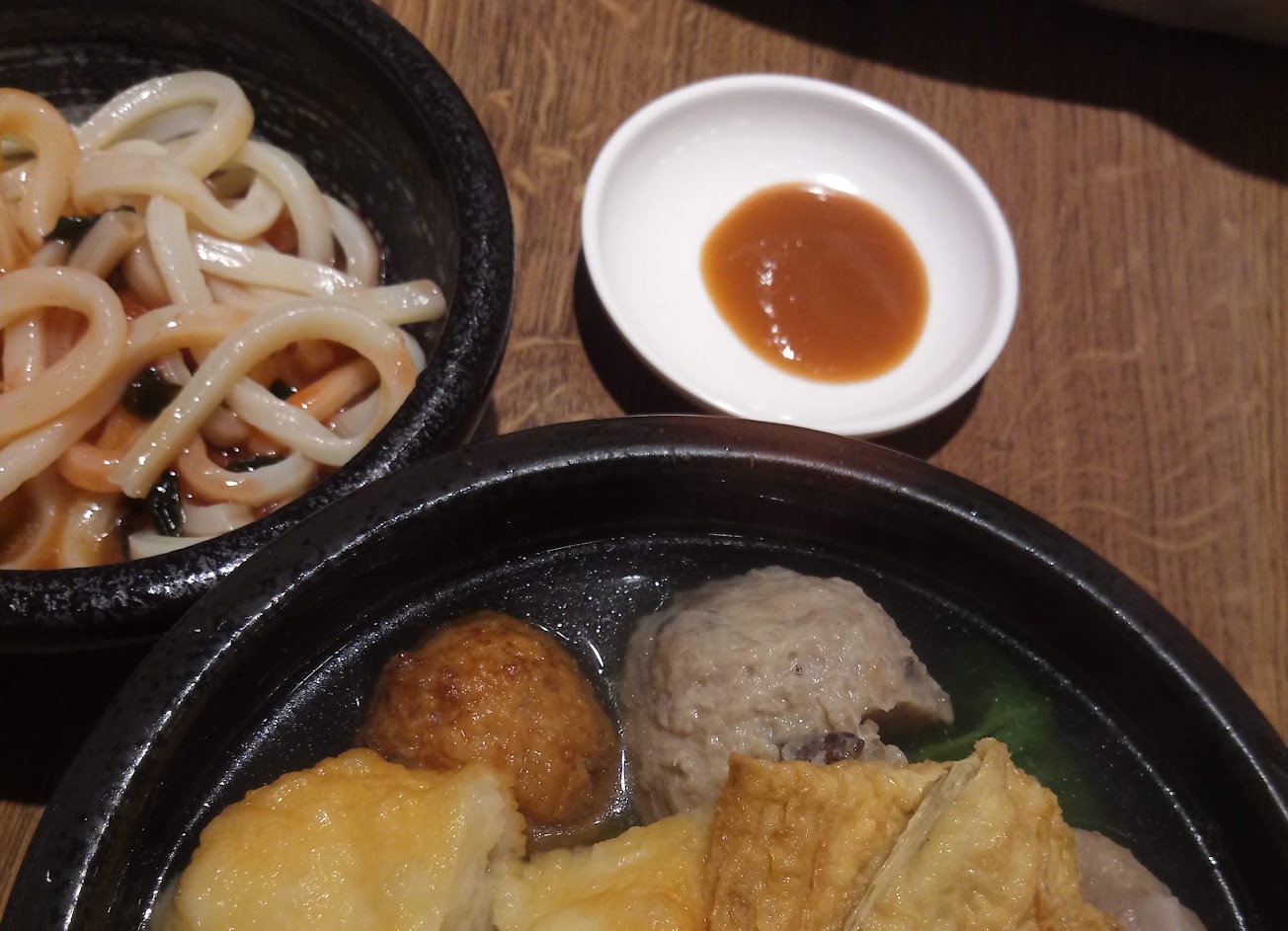 午間定時套餐份量還挺足夠的 有一碗關東煮加上一碗烏龍麵(可換乾麵) 和半顆溏心蛋 手工肉丸彈牙又扎實,推薦 甜不辣跟米血糕也挑選的很好 冰箱內有關東煮醬、辣椒醬、哇沙米三種 很可惜的是辣椒醬完全沒有辣度