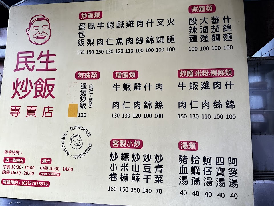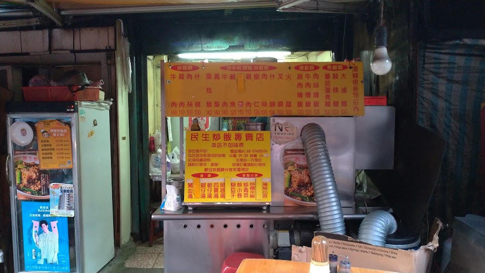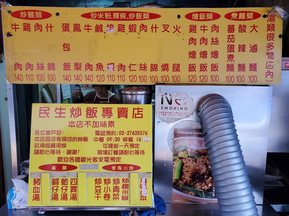 1.名氣很大、座位稀少、外帶等待很久,不先打電話很難買得到還會被老闆嗆罵,最好跟前面的顧客炒一樣的以便一次起鍋,咱能體諒,但是不代表在下是來找麻煩的奧客,多次光顧,尤其調任松山機場海關時期,家裡每一次都點三百四百元的炒飯,還不包含跟海關同仁及中科物流人員一起訂餐洽詢外送親取,或許不算是散客吧?!所以應該有評論的資格,但是一致覺得不再訂購民生炒飯;還有…..很好奇?….有哪個外國觀光客知道要先打電話預約訂購的,只可能是常住一段時間的背包客知道吧?!希望有前輩指引解惑; 交通情形:民生東路過了光復北路往新中街方向,兩間腳踏車行旁巷內,附近住戶多?️停車不易。 2.時常訂購: ❶鹹魚雞粒炒飯真的很好吃,但是點的人少很難一起炒; ❷肉絲炒粿條很不錯,但是民生東路四段的大樹下小吃的炒粿條則是超棒的(以前的時候,男老闆還在世的時候);什錦炒麵也叫過; ❸火腿炒飯或培根炒飯; ❹蝦仁炒飯; ❺牛肉炒飯; ❻鳳梨炒飯; ❼肉絲炒飯; ❽什錦炒飯;