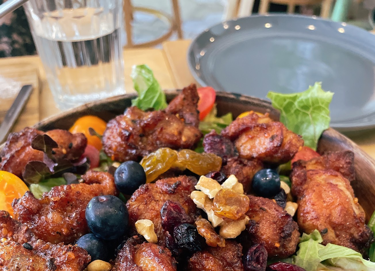 唐揚雞沙拉 唐揚雞蠻香的,略帶甜味 沙拉加了小番茄翰各種堅果,還蠻好吃的