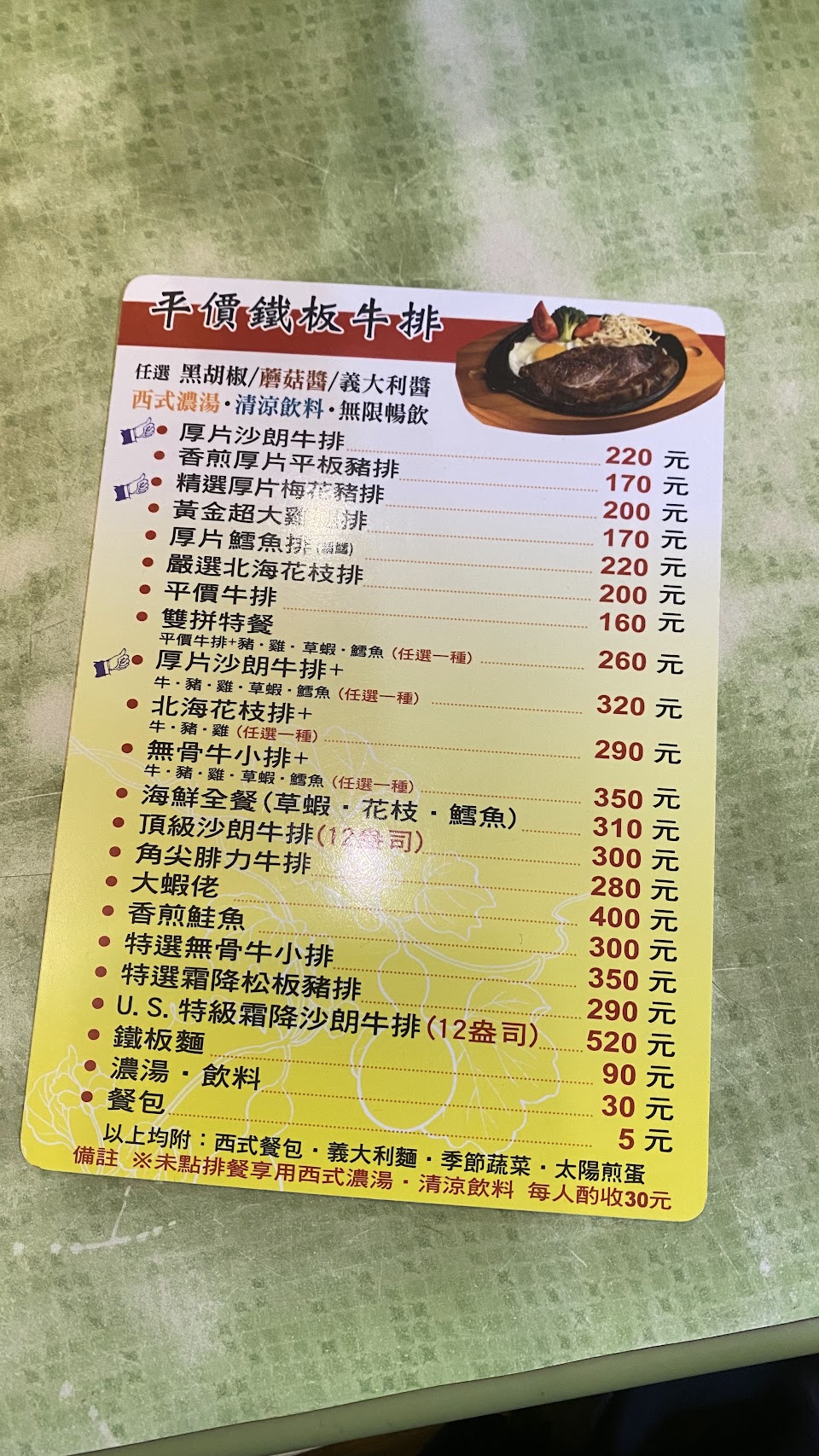 平價牛排來說,上次在新莊的口吅品的品質跟口感比許多台北市平價牛排店好吃很多,但今天饒河街店整個品質有落差多,也許是在台北市設店相對也許成本比較高或在夜市比較忙,味道與服務就差很多。
