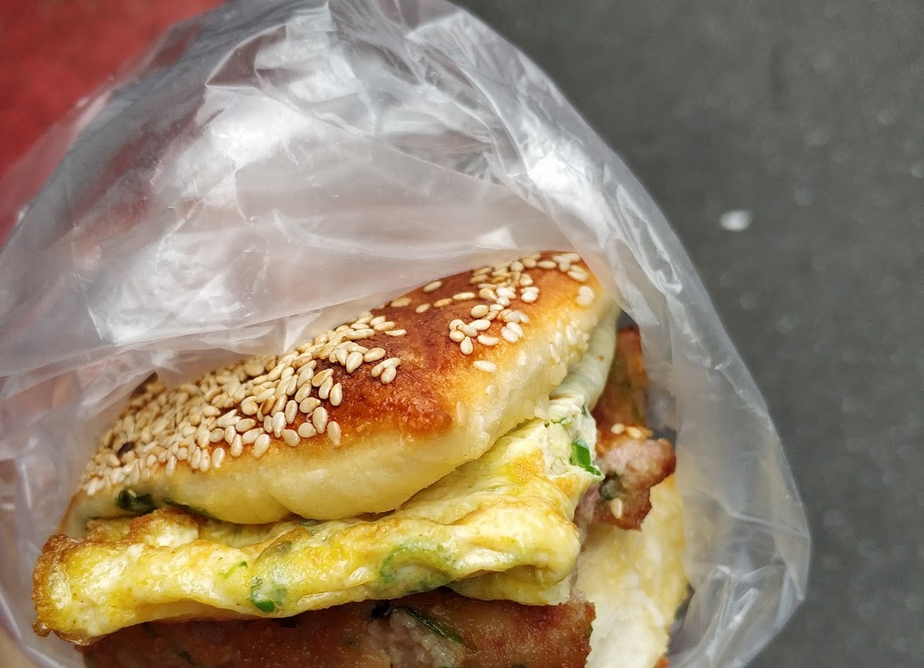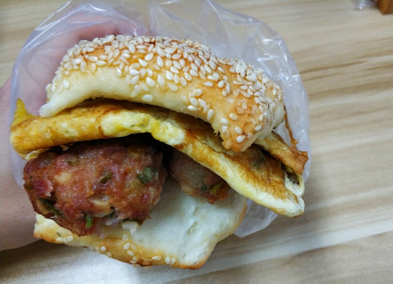 豇豆燒餅蛋很好吃,燒餅表層烤的很酥,內層厚度有,很有嚼勁,最重要的是帶了花椒的香氣,超正。獅子頭也蠻香的,獅子頭飯團份量蠻大可以吃頗飽。