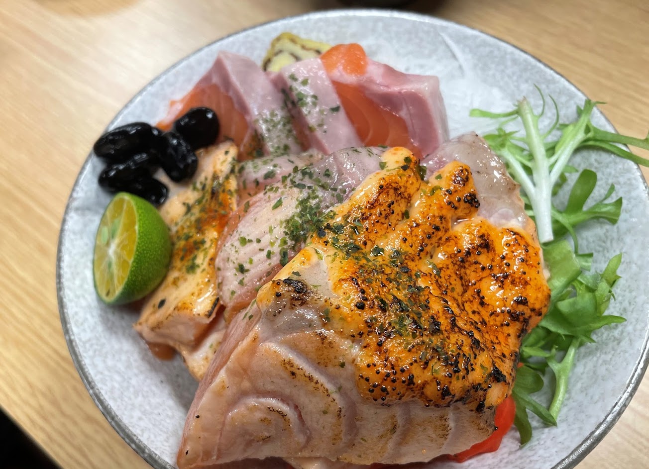 主餐均有附滿滿大塊不老不腥的魚肉味噌湯,湯頭微甜像關東煮+味噌,熱騰騰上桌,另人一口氣先吃完,結果就已半飽,丼飯上桌看似不大,但碗很深,層層堆疊,招牌裡有甜蝦/干貝/軟絲/好幾種類生魚片約7片,裡面的細切軟絲非常好吃,鮭魚三重丼有9大片肥美的鮭魚,原味/焦糖炙燒/魚子沙拉醬炙燒各三片,喜食鮭魚的朋友會很愛,基本上料吃完配幾口醋飯就粉飽,根本就吃不完裡面的醋飯了~