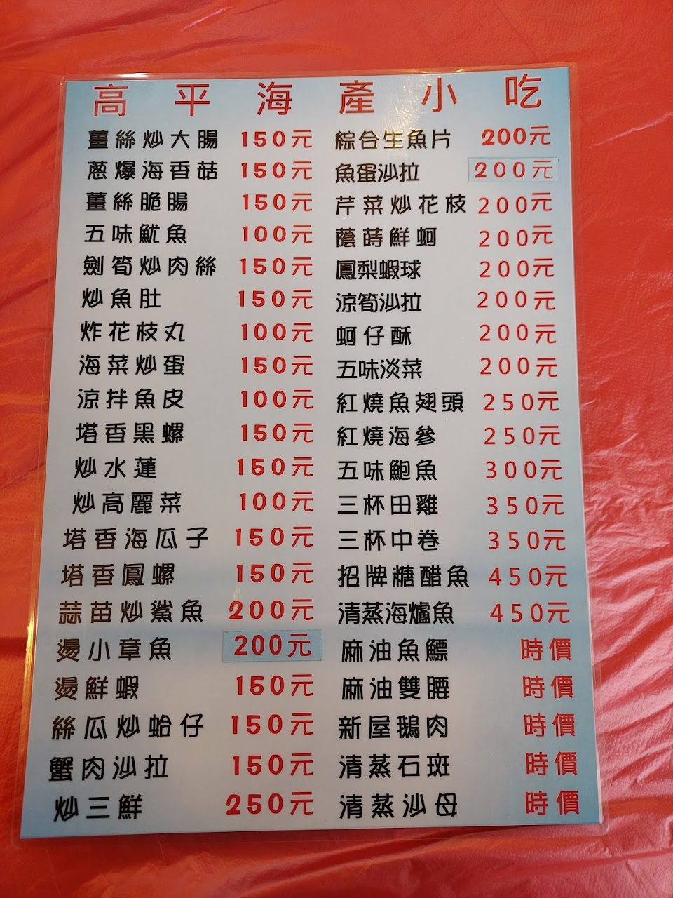 點了5樣菜,其中燙小卷跟燙蝦子各250元,點完餐才發現隔避(高平小吃)蝦子只要150元,價錢差了快一半不說,菜單上明明寫「燙活蝦」但有兩隻殼都黏在上面,吃起來也沒有甜味,很難相信是活蝦