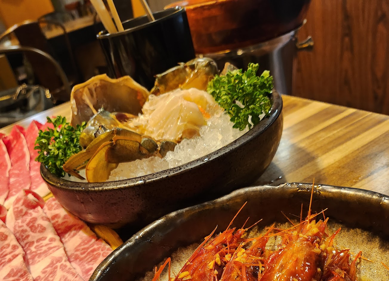 先選擇鍋底(不管哪種鍋底都有蛤蜊),再選擇套餐種類。因為沒吃過,就選擇最基本的經典雞湯蛤蜊鍋+雙人商務豪華海陸套餐就好。 一開始服務生會將蛤蜊放在鍋子裡面蒸,為了要將蛤蜊的湯汁作為湯底,蛤蜊會蒸的稍微偏乾一點……以我本人這麼愛吃蛤蜊,吃一大碗,最後也是覺得有點膩,耶有點鹹。 肉品的部份選擇了牛板腱&松阪豬(加$80)……松阪豬切的比較厚片且偏油,大概吃個2~3片就開始覺得膩口。 海鮮盤份量十足,也都還蠻新鮮的,蚵仔有很大顆的,也有小小顆的,品質有點參差不齊。 蔬菜盤就大同小異…… 沾醬的部份比較特別一些,沒有一般火鍋店的醬料,只有4種醬料……兩種辣椒&調味過的洋蔥末&泡菜泥(?)。 最後吃的差不多了以後,服務生會來煮松露蜆粥(+蛋)……個人覺得松露&滿滿海味的湯底無法融合,就是兩個平行線的味道在嘴裡?。 餐點:3 服務:3 氣氛:3