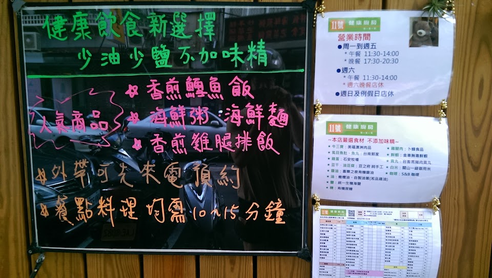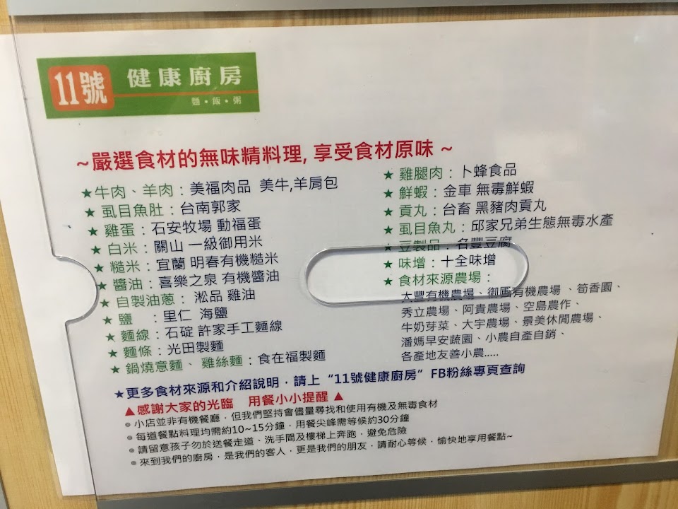 少油、少塩、無味精,強調健康的餐飲方式,適合養生族群. 民生社區?強調健康餐飲的餐廳,食材來源及履歷都有清楚說明,烹調方式簡單、家常(水煮、清蒸),沒有過多的調味料,口味清淡,份量可以依食量點餐和組合,有各種麵食、白飯、糙米飯可以選擇,(可以單點或加點,飯可以點1/2,2/3),吃得到食材本身的風味,受到許多當地居民歡迎,用餐時間一到,內用、外帶顧客眾多,時常要等待20-30分鐘,建議可以先打電話訂餐,省去等待時間,因為人手只有老闆夫婦兩人。在悠閒的民生社區是無妨的。