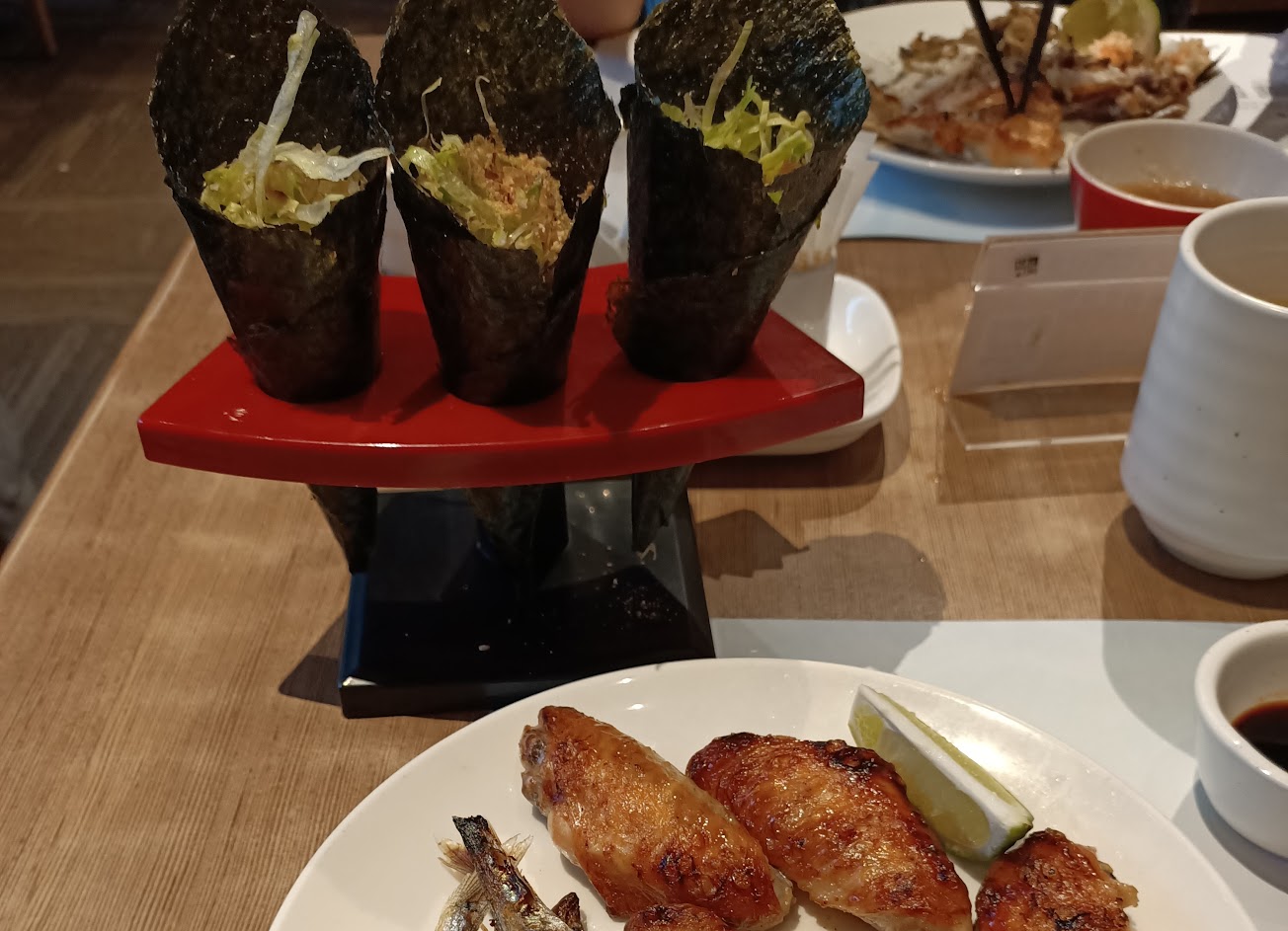 來吃下午茶,味道做的不錯,生魚片口感不錯,鮭魚壽司也不錯,手卷ok. 烤魚下巴不錯,炸蝦不太好,炸雞塊有幾個炸的不錯,但有幾個都是粉漿太多了。藍色的雞尾酒好喝,熱拿鐵好喝。烤布雷極推。這個價位,餐廳算是力求讓客戶滿意,盡心盡力了。極推。