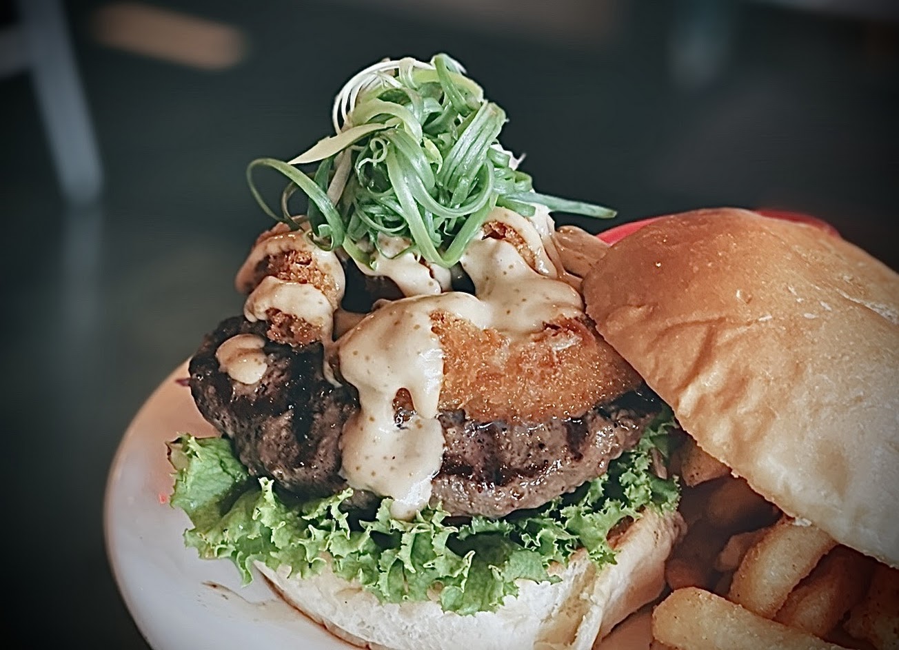 我點了花生醬牛肉堡?和明太子芥末轟炸廣島牡蠣雙拼牛肉堡,附餐搭配薯條及炸杏鮑菇不過炸杏鮑菇太油,醬料調味不錯,建議不要搭配可樂,因為份量會飽到吃不下,第一次帶女友來不宜。 平均每人消費金額 $800-1,000 建議的餐點 花生醬牛肉堡