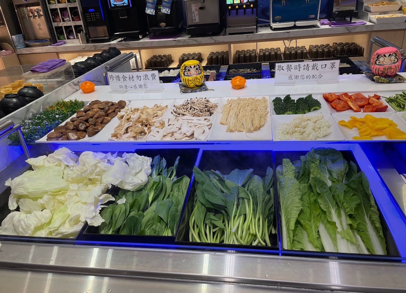 這裡是個人很喜歡的一間店,他有幾間分店,但個人比較喜歡這裡(南京東路),來台北的時候常來這裡用餐,火鍋吃到飽,座位區還蠻大的,肉品的部份填單點餐,沒有限制,其他為自助吧,有豐富的蔬菜區,海鮮多樣又新鮮,有螃蟹,蝦子,蛤蜊,鮮蚵⋯,還有個人很喜歡的毛肚,在火鍋店來說,個人覺得並不常見,也可能小弟去的餐廳還太少,總之,光是有毛肚就夠吸引我來了,也有一些熟食,包含夠味的鴨血,肉燥(飯),滷蛋,渴了還有多樣的飲料,冰沙,養樂多及罐裝飲料等,飯後還有水果,蛋糕甜點,冰淇淋跟冰棒,都提供了豐富的選擇。