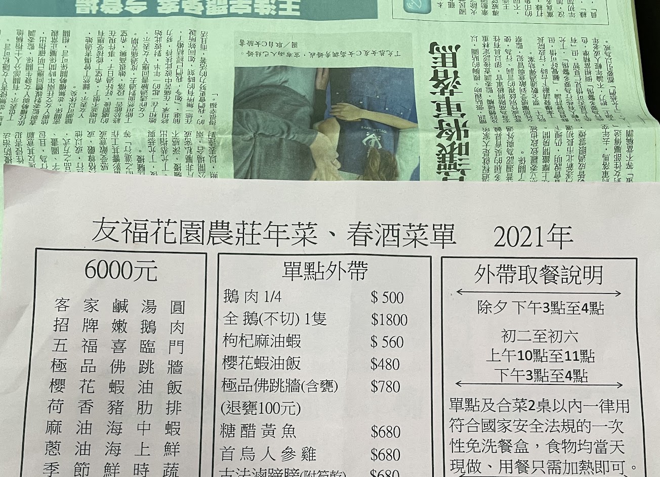 訂了年菜的合菜 6000元的 菜單上寫豬肋排 但實際上是排骨 另外菜單第一道寫客家湯圓 實際收到卻沒有客家湯圓 打過去問他們卻辯說這不是他們的菜單 或辯說我們拿的是去年的單子 明明就是友福2021的單子 第一道就是客家湯圓(下圖) 我們只是確認而已 但店家那種態度感覺我們是奧客在硬凹 感覺很差