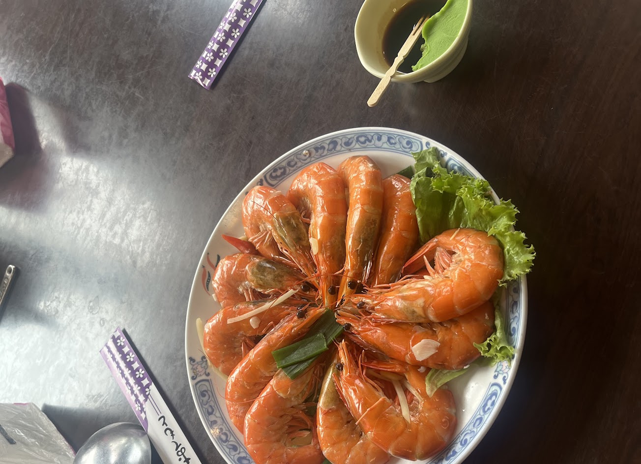 我是外帶的,這家店的生意很好,第一次點了半隻鵝肉500元,骨頭好多,肉質普通,沾料不錯;炒龍鬚菜200元,莖葉很嫩,份量很足;蝦子320元6隻很大隻,還算新鮮,可惜有頭身分離的,觀感不佳。