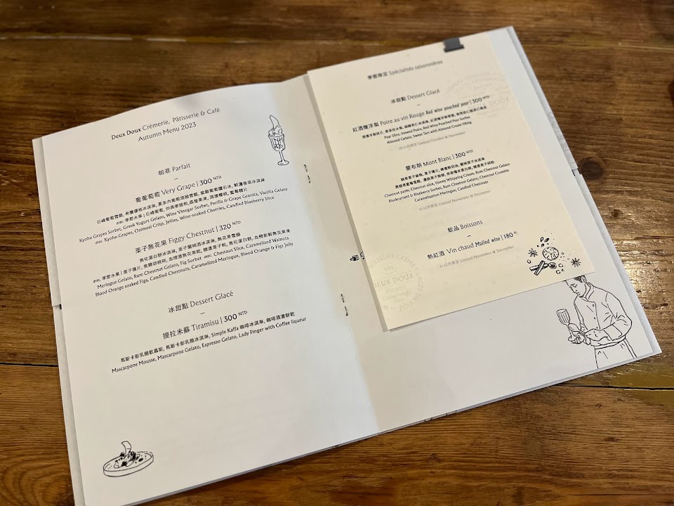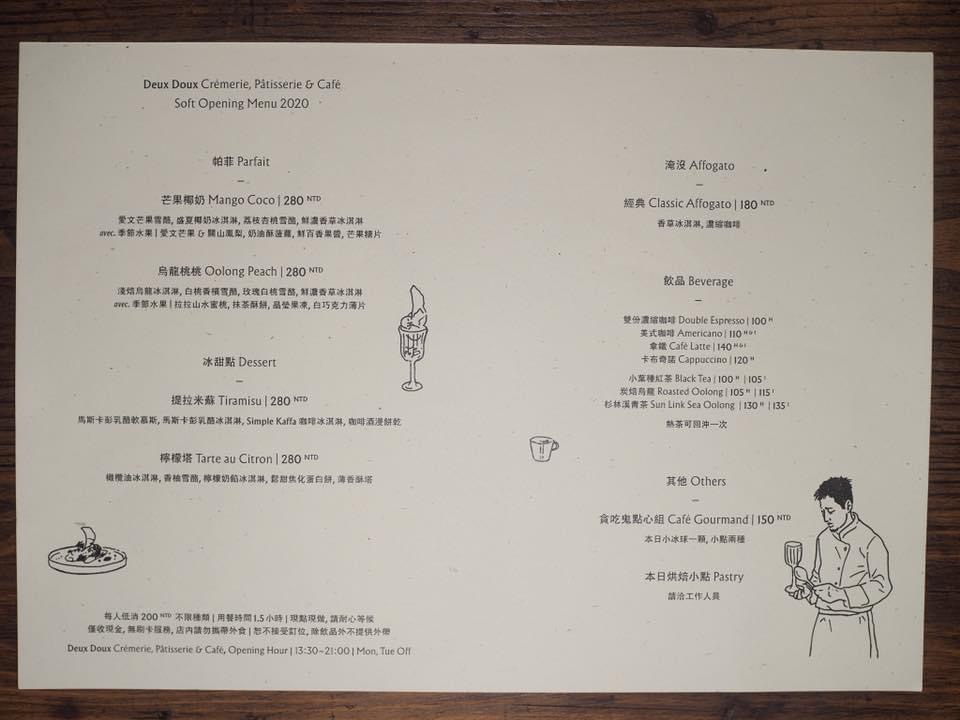 Deux Doux crèmerie, pâtisserie & café 法文店名很直接地傳達出了甜點身世,根據店家在 Google maps 上的介紹,這家店的菜單由留學法國的主廚所設計,甜品的製作技法也是以法式精神為創發。