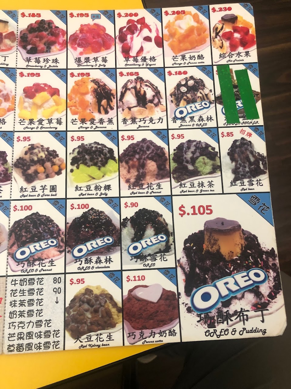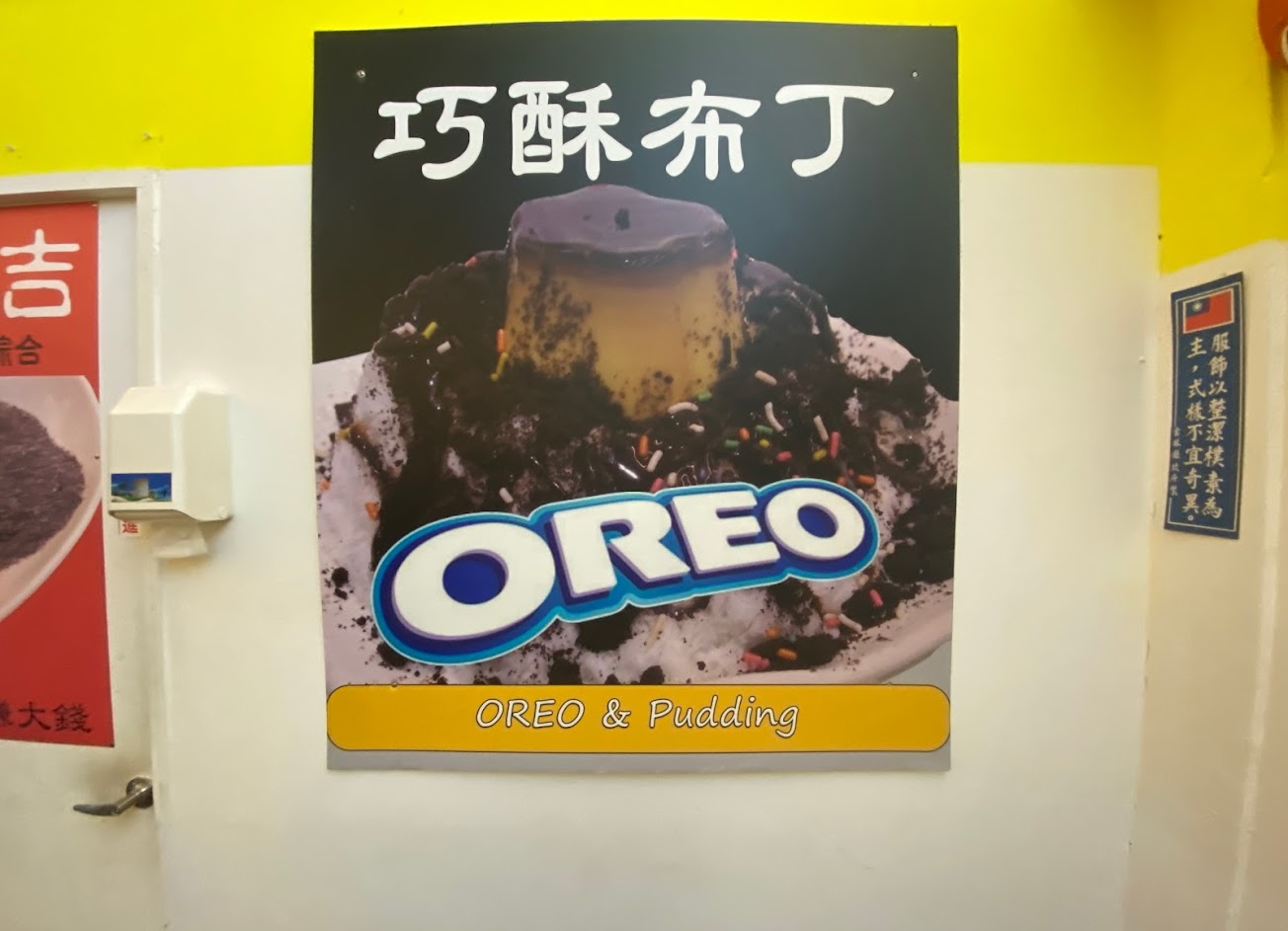 朋友邀約來彩虹橋參加扶輪社辦的路跑活動,除了健身外,最讓人期待的是可以順道逛夜市吃好料,彩虹橋鄰近饒河夜市,我好多年沒來了,路跑活動結束後,扶輪社朋友即帶我們到這間冰果室,我們一群人直接包了後面幾排座位,似乎有人認識這間店老闆,幫我們佔位了,真是熟門熟路,桌上還放著一箱這夜市著名的胡椒餅,分送大家吃,先吃餅再吃冰好?還是先吃冰再吃餅好呢?傻傻都可以,這間冰果室的招牌與裝潢具有復古風,牆上掛置許多早期海報及裝飾,彷彿搭乘時光機回到了過去,至於是哪個年代我也搞不清楚,算是店的特色,店內餐點有刨冰、麻糬、豆花等,雖說是古早味的店,但餐點頗富新意,例如OREO巧酥布丁冰、珍珠奶茶冰等就很新穎奇特,喜歡水果的人也可選擇水果類刨冰。