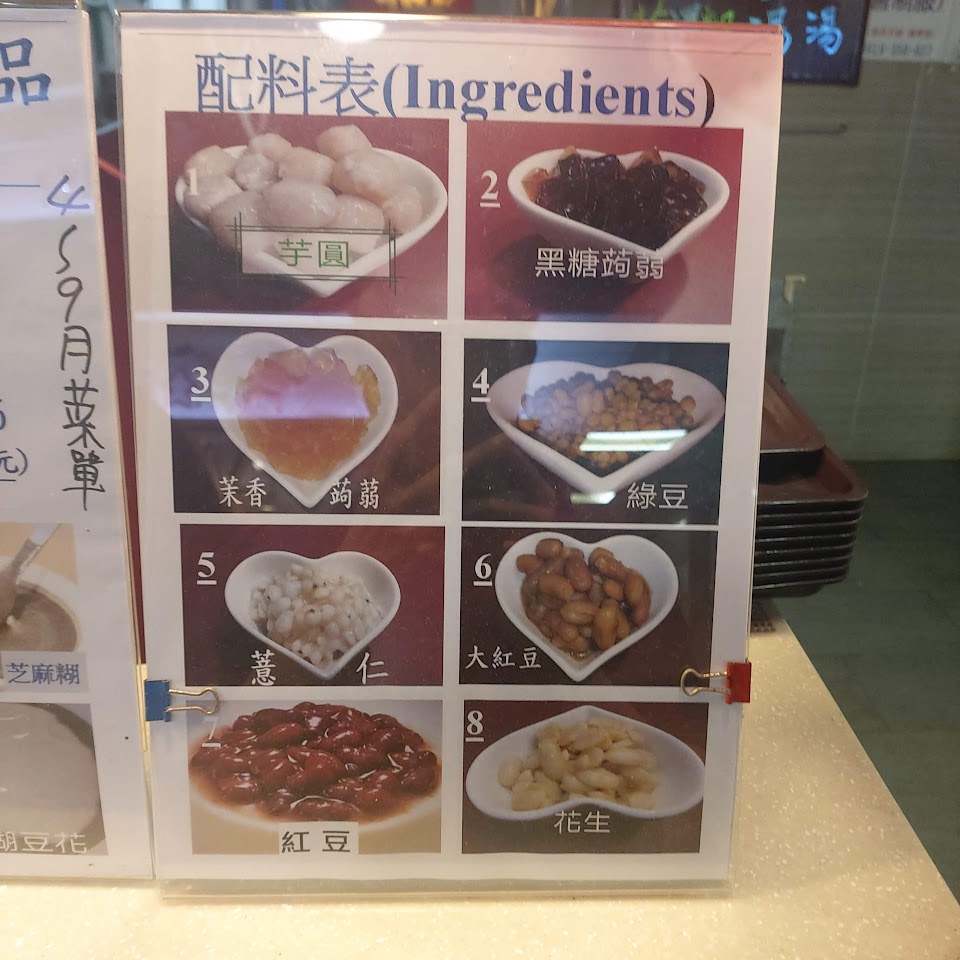 有8種配料可以選擇,除了芋圓以外都是店家自製的唷 另外也有販售鮮奶酪,店家不是用吉利丁而是用吉利T,所以素食者也可以食用,也沒有加鮮奶油唷(使用科克蘭的鮮奶)