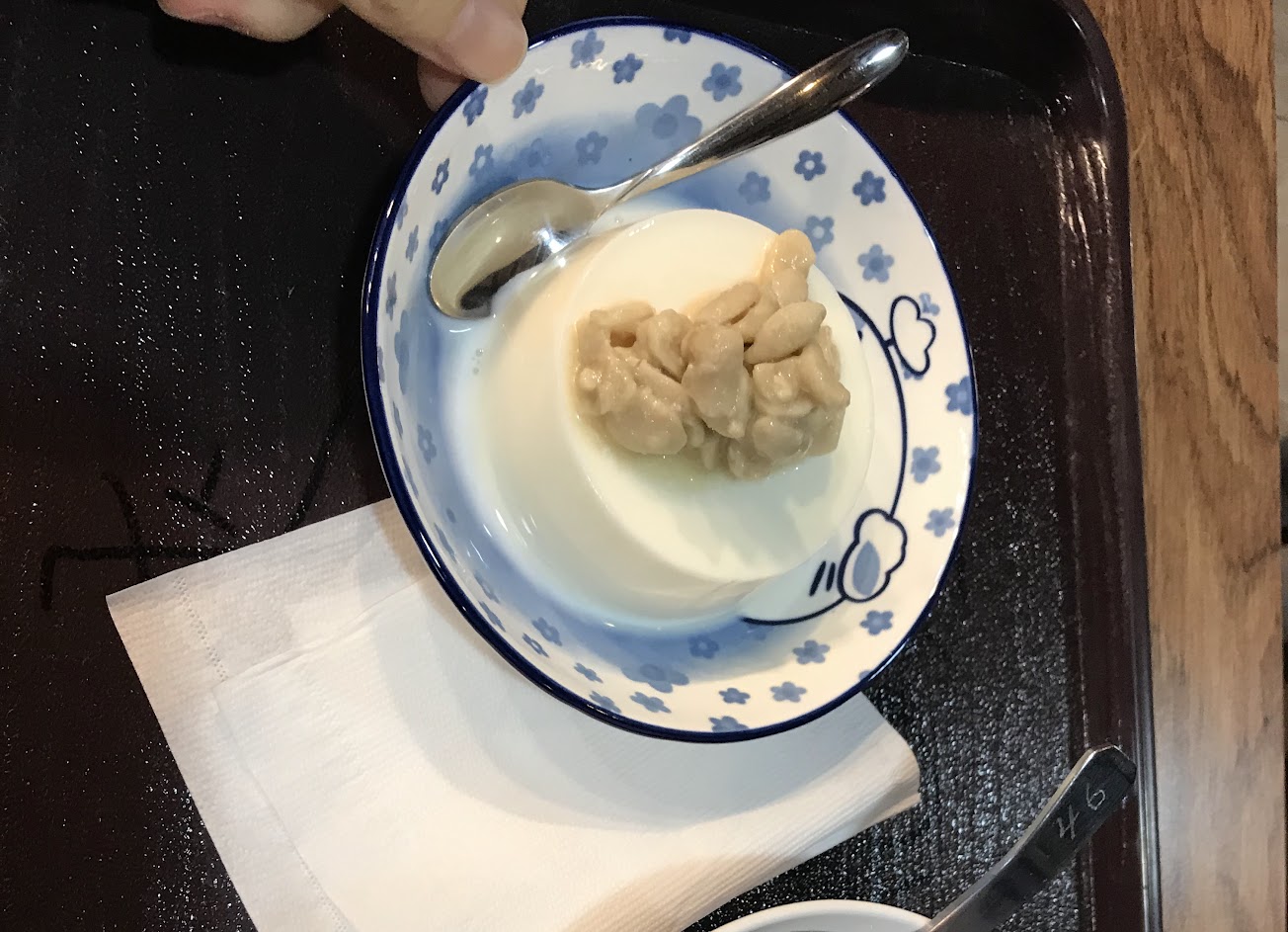 在 Mo Tai Yang 吃午飯後停下來。乘坐大樓拐角處的自動扶梯到2樓,商店位於美食廣場後面的46號。指著菜單點豆花。這是一種溫和的甜味,可以感受到材料的味道。可以用遞給我的紅糖蜂蜜自行調節甜度。