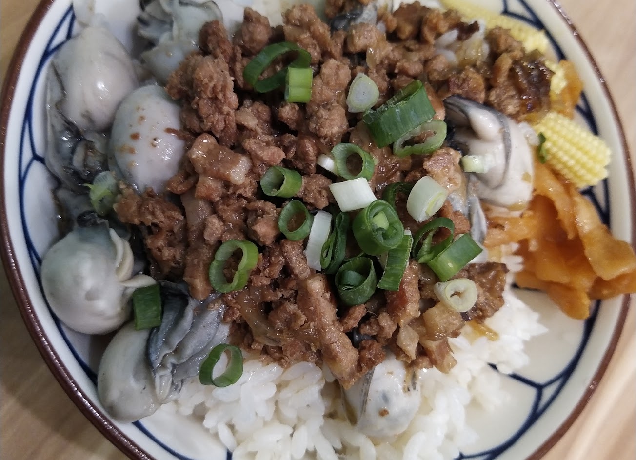 飯量的多寡可以自己決定,鮮蚵舖在魯肉飯上面,少見的另外還加了玉米筍和蘿蔔乾。