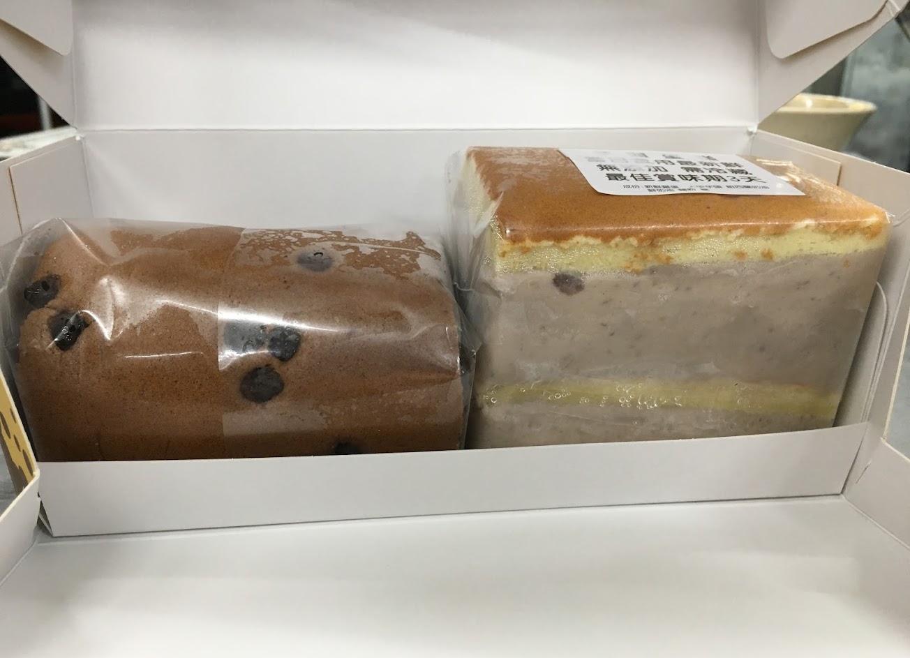 當天可以13:00過後詢問老闆當天還可以買什麼,芋頭非常紮實不甜不膩很好吃,還看得到芋頭的纖維,真材實料,巧克力捲裡的巧克力很像生巧克力一樣好吃,一樣不會太甜,外頭還可以吃到脆脆的巧克力,口感非常棒。而且還購買半條,對於小家庭或個人負擔不會太大。