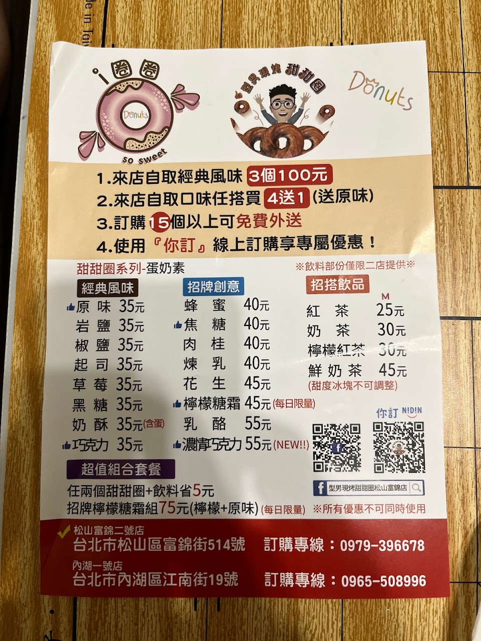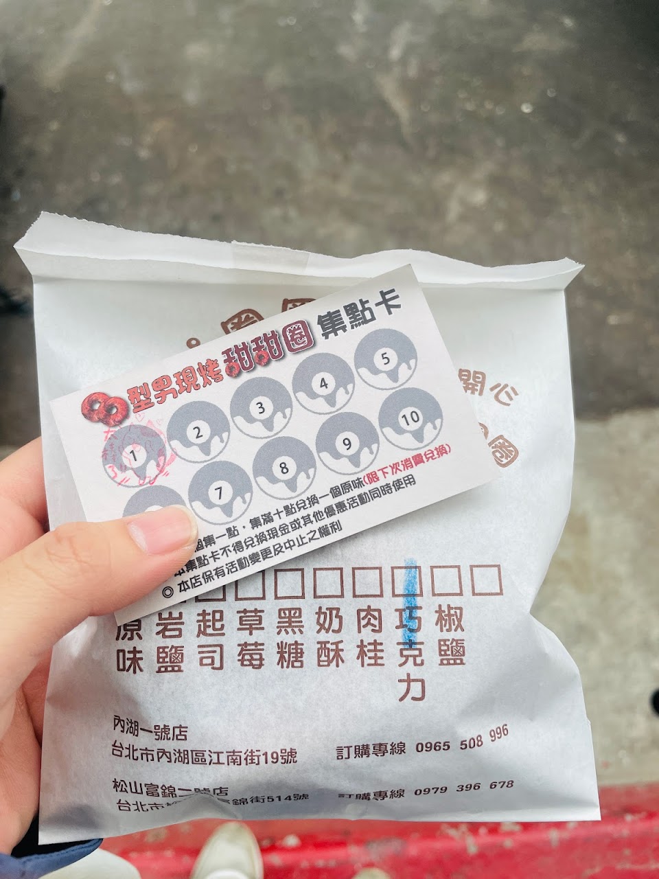 好吃的型男現烤甜甜圈,老闆老闆娘態度也很好喔,原味$30,巧克力口味$35,買四送一。集滿10點再送一顆。可用街口或linepay支付喔。
