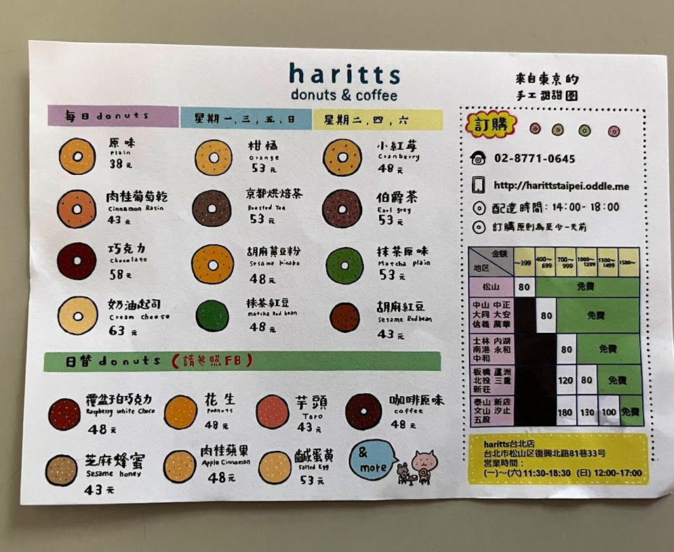 源自日本的Haritts,最早吃過台中店,剛出爐的甜甜圈令人印象深刻。在台北店都剛好錯過出爐時間,且所剩口味不多較可惜,但甜甜圈還是好吃!