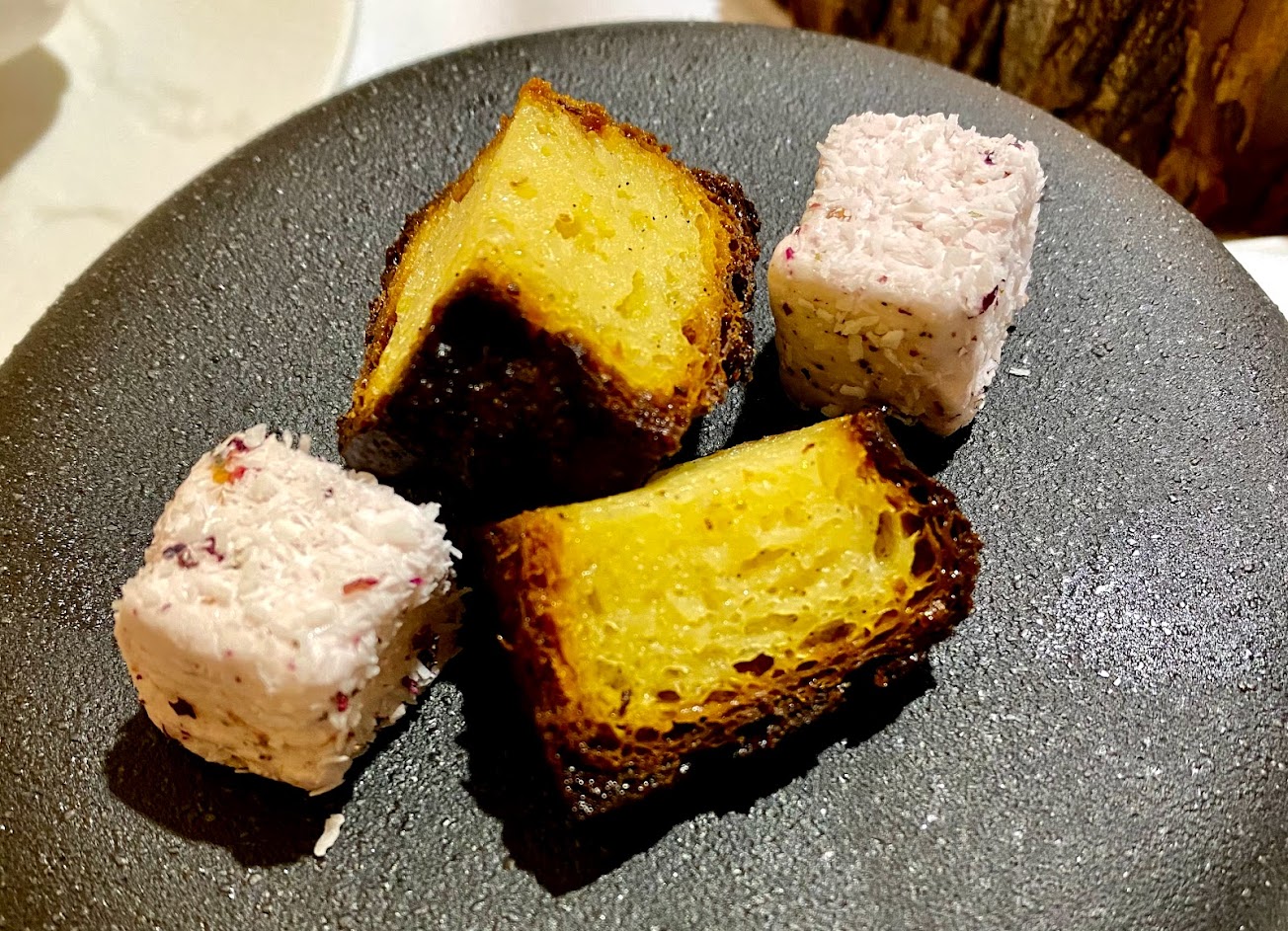 今天試的是3880套餐~ 開胃菜-味噌慕斯泡芙、吻仔魚慕斯番茄鏡面 冷前菜-雞肝慕斯 湯品-柚子蛤蜊湯 熱前菜-干貝軟絲筆管麵搭配抹茶芥末醬 雙主餐1-明蝦佐起司馬鈴薯千層 雙主餐2-熊本和牛 燉飯-西班牙肉醬佐火腿 前置甜點-鳳梨奶酪 盤飾甜點-茶的慕斯、蛋白霜、芒果雪酪 茶點-肉桂馬卡龍、瑪德蓮