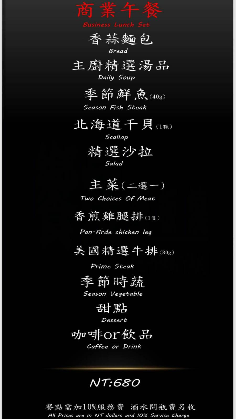 今天吃的是商業午餐套餐($680+10%),有南瓜濃湯/麵包、干貝/鱸魚、沙拉、牛小排(很薄但蠻嫩)、炒高麗菜、招待的炒飯、紅豆燒、飲料,吃下來份量剛好,以這個價位來說CP值真的滿高。商午很推~