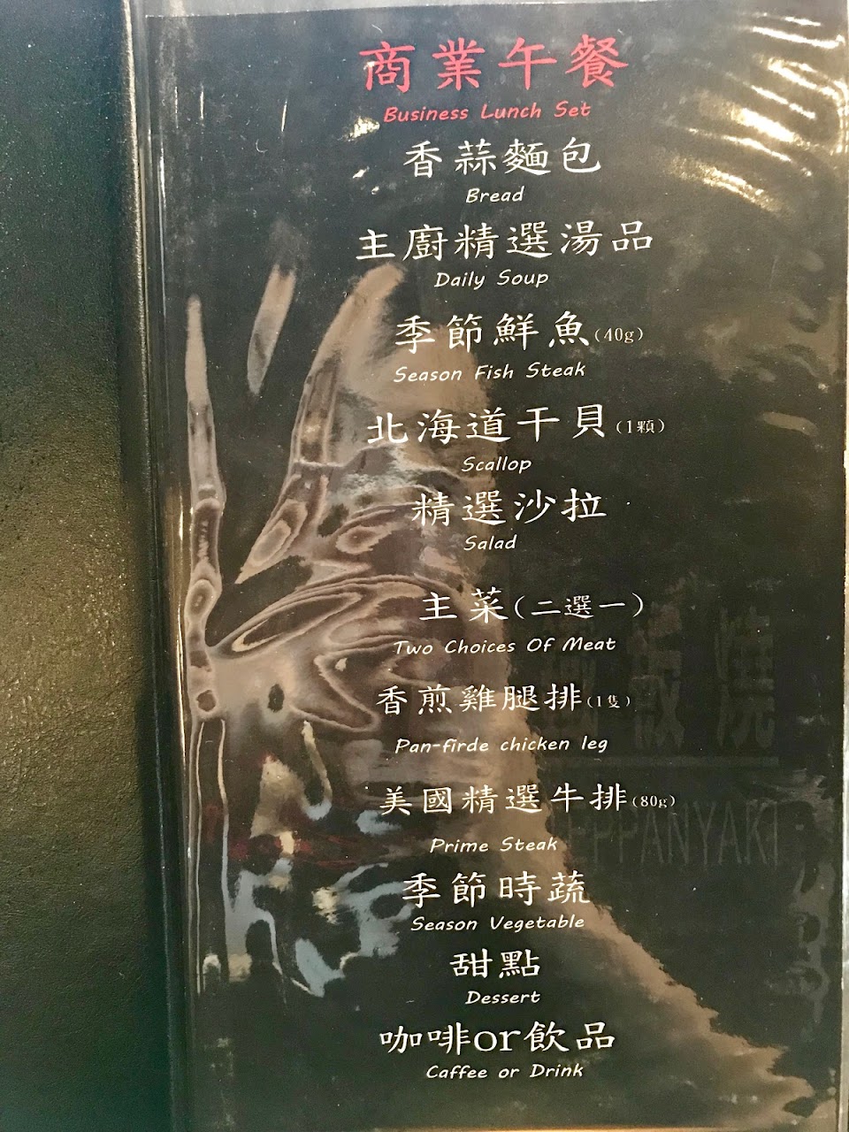 是在節慶的晚上去吃的,雖然店裡走一個比較台式然後深色風格,用餐環境真的就是普通,服務還可以就比較老派;不過東西都還蠻好吃的,也感覺得出師傅的功力,從肉類到海鮮,最後還有炒高麗菜和銅鑼燒,都是很好吃的,師傅也會用恰到好處的頻率和態度來關心每個用餐的客人;唯一比較可惜的就是份量較少,吃完有點不太過癮,沒有一般鐵板燒那種一到接著一道,到最後非常很飽足的感覺,適合食量小一點的人。