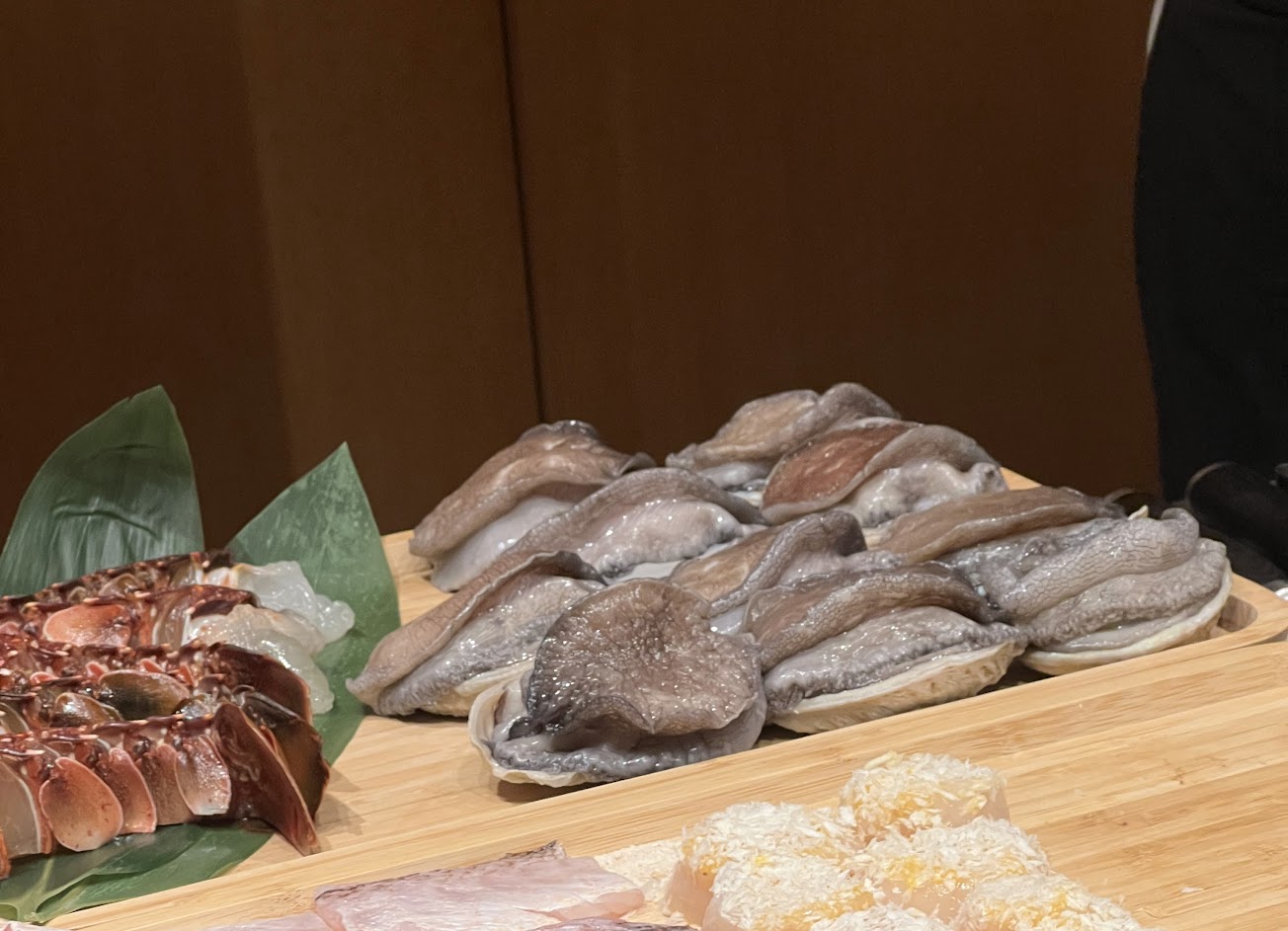 水雲醋凍|滑蛋咖哩蟹黃泡芙|螢烏賊|鮟鱇魚肝|廣島牡蠣佐白昆布|石老佐蘑菇|海膽|鮑魚|龍蝦[澳洲水姑娘]|和牛漢堡排|和牛牛排|牛油炒飯|龍蝦頭味噌湯|鳳梨乳酪蛋糕