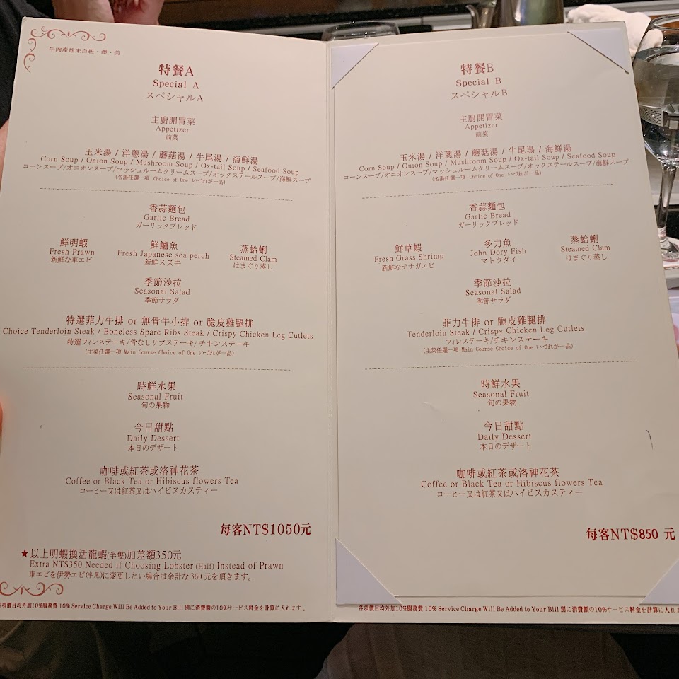 兄弟飯店 14樓的鐵板燒餐廳,開胃菜是小鮑魚、大蒜麵包,湯有很多種可以選,牛尾湯好喝。沙拉的水果有酸有甜,明蝦跟鱸魚新鮮,調味不會重口。清蒸蛤蜊呈現方式很特別,還有附一小杯的蛤蜊湯。