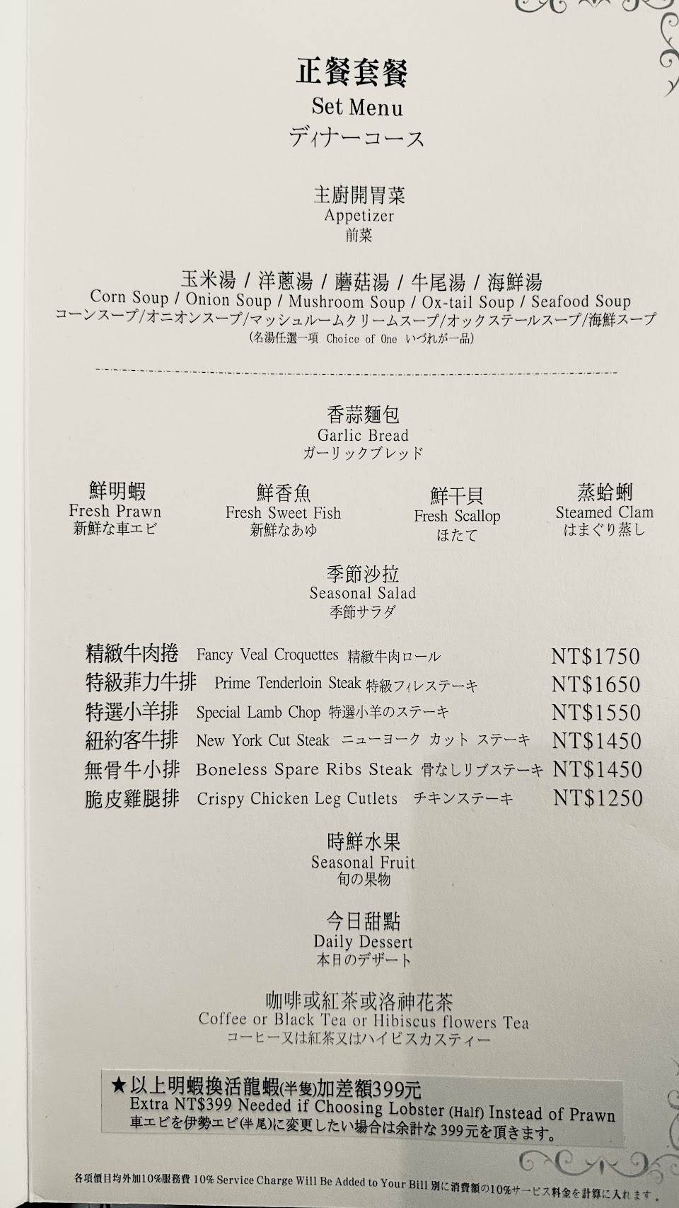 師父廚藝很好!大蒜麵包軟硬適中;蜆湯味道鮮甜;菲力牛排很嫩。另甜點樣式豐富,除了水果和水果凍外,現作的抹茶紅豆芋頭捲亦相當可口。