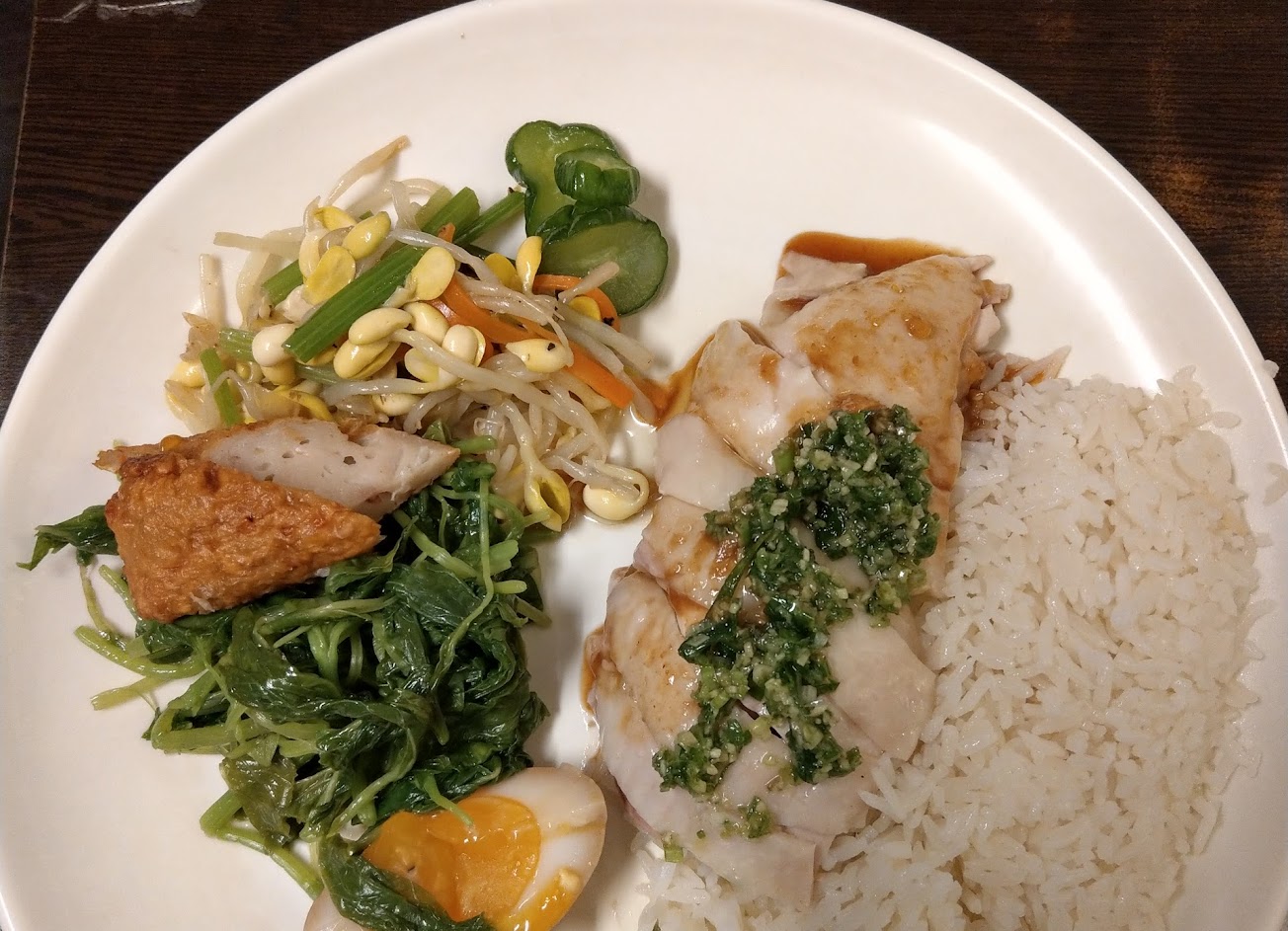 海南雞的部分真的超好吃???配菜就像普通便當店,但蔥醬和醬汁配肉配飯真的一絕ㄚㄚㄚ …